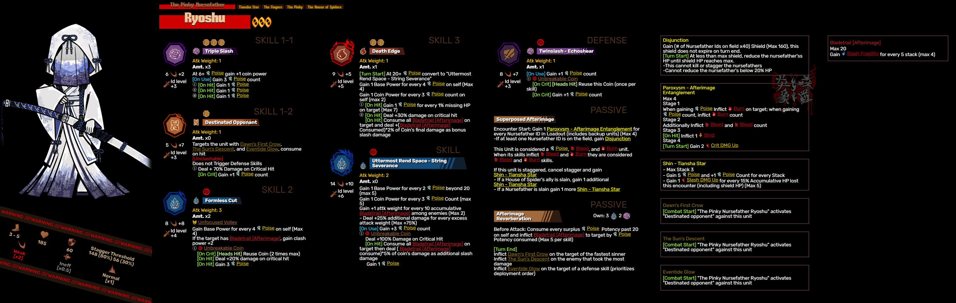 >>563159013Okay, threw together a rough idea of Pinky Shu based off the Araya boss fight and what KJH teased she'd probably be able to do.Anyway, I'd like a lot of feedback on this one because to be perfectly honest I'm not entirely sure how to go about with her>She's a poise unit>She inflicts burn and bleed>she needs to synergize with Thumb, Index, Middle, Ring, and her apprentice>She's a bunch of rerolling single coins with AOE attacks>There's no way in hell we're getting % based damage, so enjoy this proxyI don't think she'll quite work like this, but general idea is that Thumb/Middle will let her inflict burn, Ring will let her inflict bleed, and I don't know index inflicts bind because she's already poise; I think it would be too much if she also counted as a sinking ID.>I don't think we're ever getting poison, since it's basically burn with a new paint job.>She gets Shin up to 3 stacks, past, present, future self. Each has its own condition to trigger.>She gets up to 3 free s1s, each has its own trigger.>Should probably let her enable Ren's "way of the blade" buff so Sinclair can get something for all those Moonlight Blade stacks he gets.