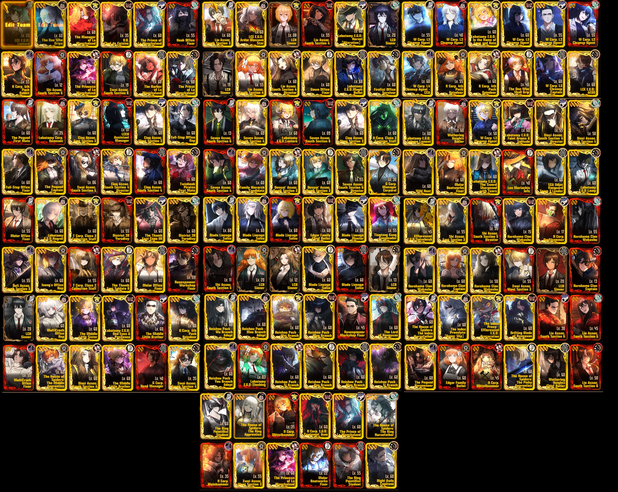 Previous thread: >>563138889Season 7 - Kumo no Ito2025.12.31 — Mirror Dungeon #7 - Mirror of Names and Spiders2026.02.19 —Refraction Railway Line 5 - Merry Go Round2025.02.20 —>Upcoming Events2026.04.16 — 2026.05.14Chapter 9.5 - Twining Threads>Current Events2026.03.19 — 2026.04.16Chapter 7.5 - LCB Regular Check-up BokGakS>Upcoming Extractions2026.04.16 — 20236.05.14[000] The Ring Fauvist Docent Rodion[000] The Ring Fauvist Student Meursault [ Event Reward ]>Current Extractions2026.04.02 — 2026.04.16[000] The House of Spiders: The Ring Nursefather Hong Lu[000] The House of Spiders: The Ring Apprentice Faust2026.03.19 — 2026.04.16[000] LCE E.G.O:: AEED Gregor[HE] Ardor Blossom Star Faust2026.04.02 — 2026.04.16Target Extraction: [ Yi Sang ]FAQs! This game is directly tied to the setting of Project Moon's previous games, Lobotomy Corporation and Library of Ruina, and is set after both. Expect spoilers for those games in this thread.! The tutorial is important.>Download linksAppStore: https://apps.apple.com/app/limbus-company/id6444112366Google Play: https://play.google.com/store/apps/details?id=com.ProjectMoon.LimbusCompanySteam: https://store.steampowered.com/app/1973530/Limbus_Company/>Other linksOfficial twitter: https://twitter.com/limbuscompany_bOfficial youtube: https://www.youtube.com/@ProjectMoonOfficialOfficial site: https://limbuscompany.global>Required readinghttps://mega.nz/folder/xosDkZ5Z#Wt4JpUt5Bb2XG77pxuuXpw>For all your EGO and Sinner info needshttps://limbus.kusoge.xyz/https://gll-fun.com/en/>Useful resources and a general guidehttps://rentry.org/lcg_resourceshttps://rentry.org/lcbguidehttps://rentry.org/LCB_optimal_grind_guidehttps://lcb-days-since-last-id.carrd.co/https://lcb-days-since-last-ego.carrd.co/>Countdownhttps://lcbcountdown.carrd.co/