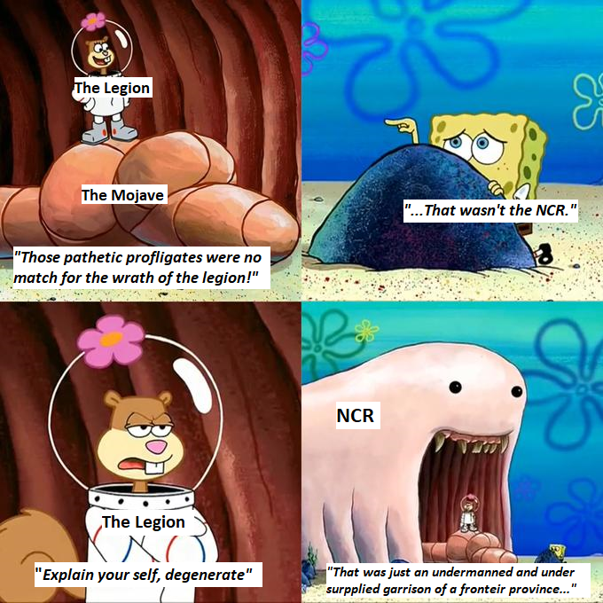 >>563183245>Just flat out saying 50% of the Legion population are treated like dogs lmfaoIt really highlights why the Legion is losing to the NCR. They're 100% against the Legion and will use anyone who wants to fight or support them.