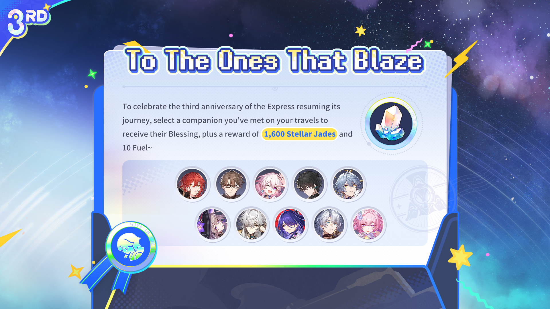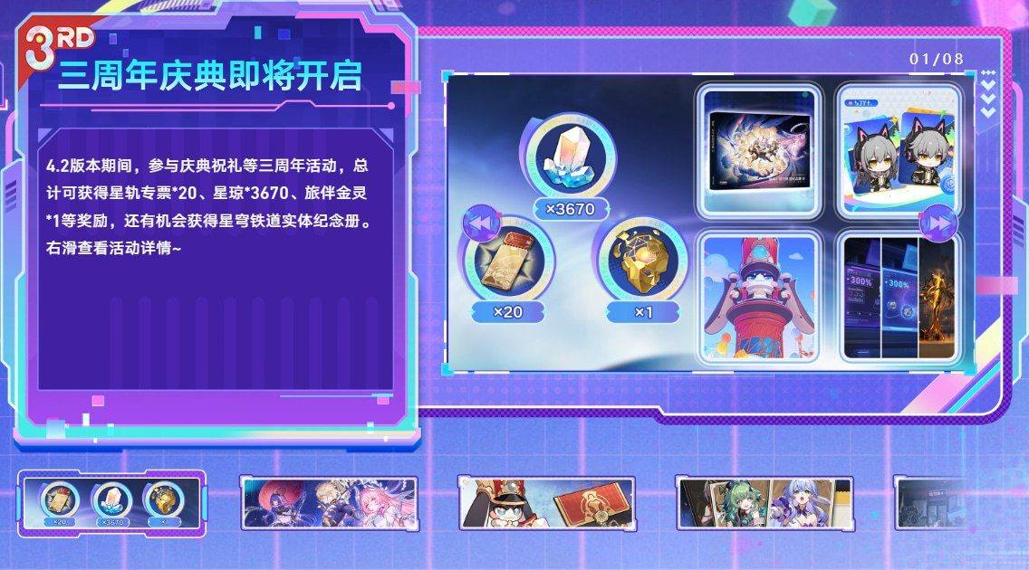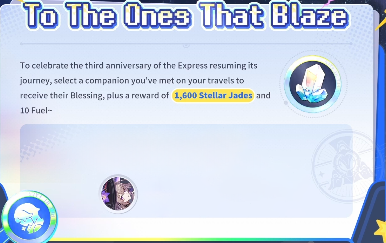 Honkai: Star Rail's Third Anniversary Grand Opening! Log in and participate in the web event to win a share of a massive pool of Stellar Jades and in-game rewards. Send a third anniversary blessing to Aha for a chance to take the "Crown of Aha" Silver Wolf LV.999-themed car and other spectacular prizes home! https://hsr.hoyoverse.com/3rdAnniversary?inviter=GA843Z8KEN&hyl_landscape=true&hyl_auth_required=true&hyl_hide_status_bar=true&win_mode=fullscreen&target_page=prize&utm_source=share&utm_medium=link&utm_campaign=web