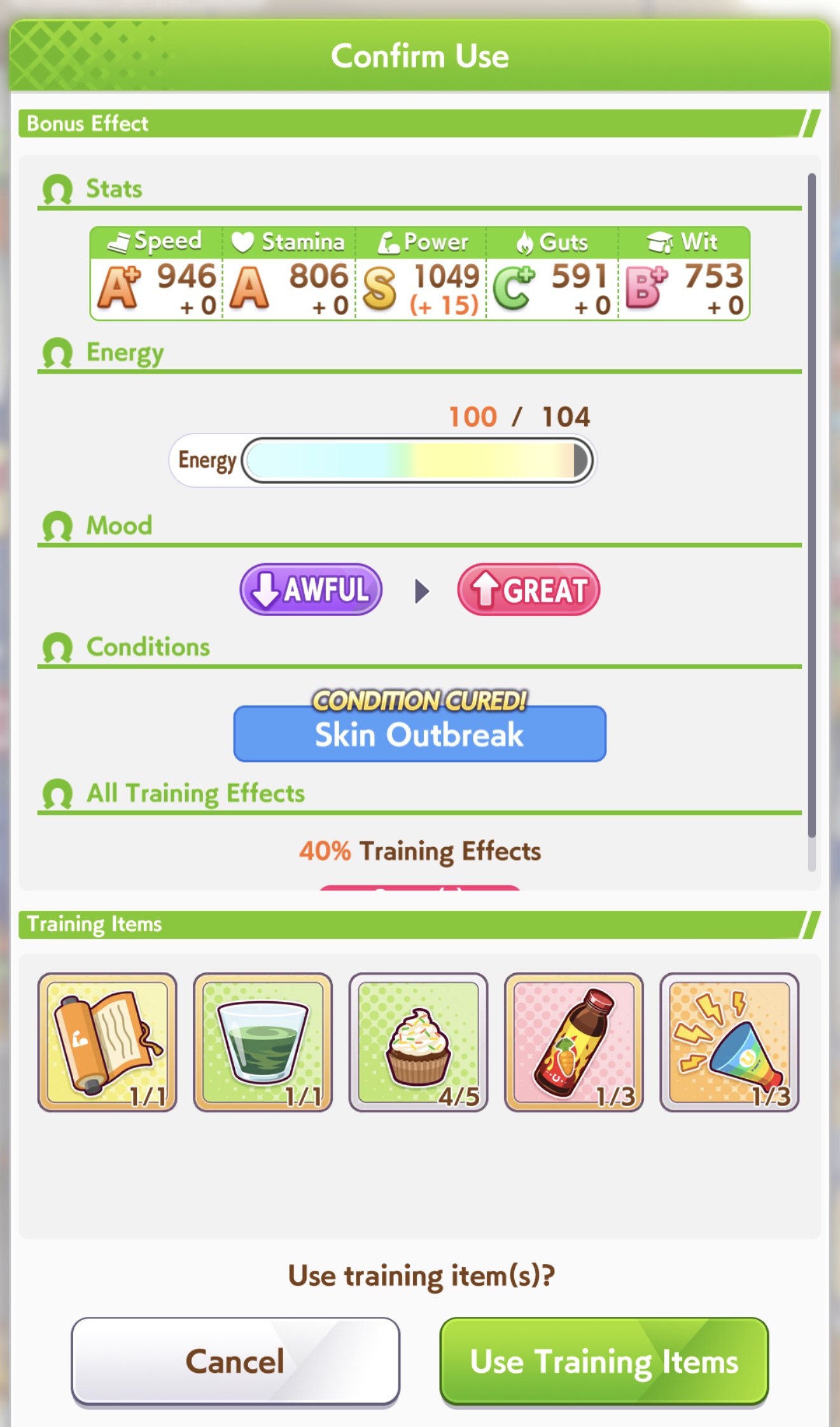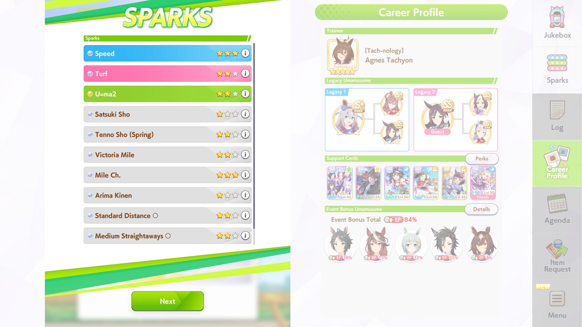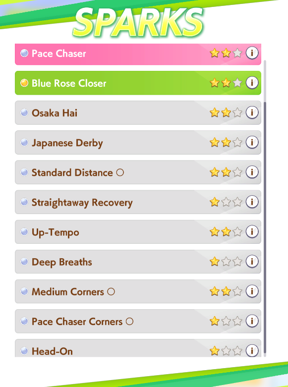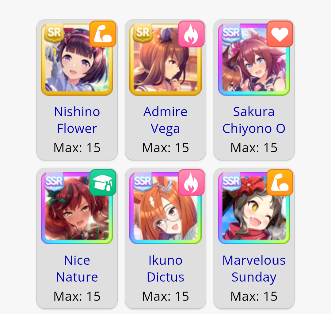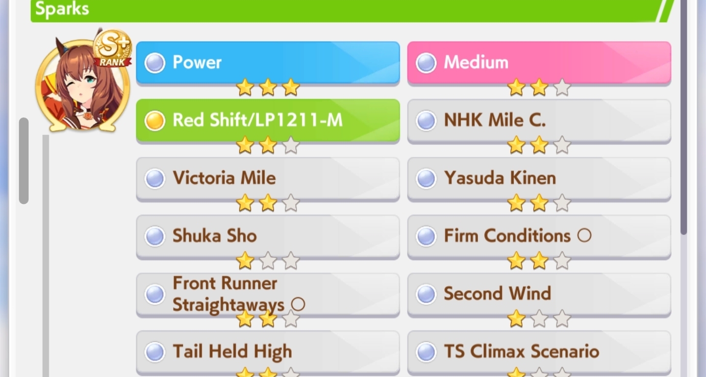 >>563185995Sure, sparks are 12* power 3* stam, sadly I don't have any high LB wit SSRs but it feels like my runs are 100% better when I borrow Fuku instead of a wit card, had the most success with something like this, can probably take Marvelous power if you have a good wit card to switch the SR out for