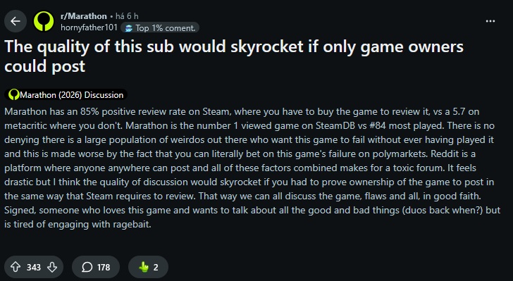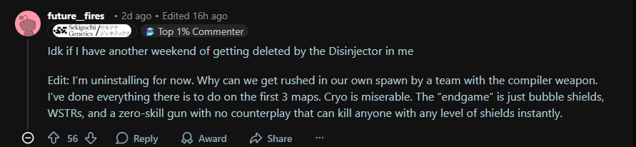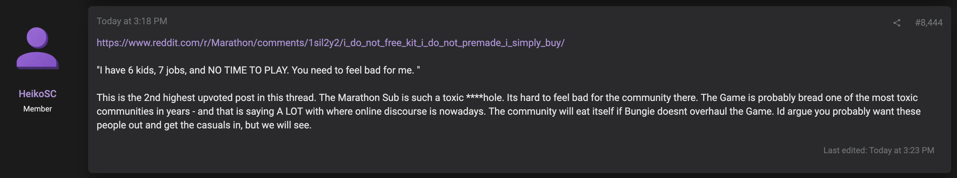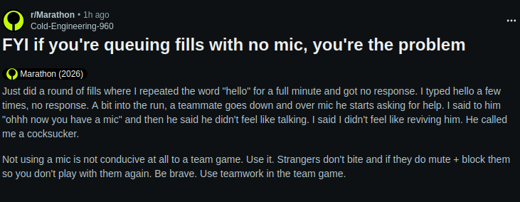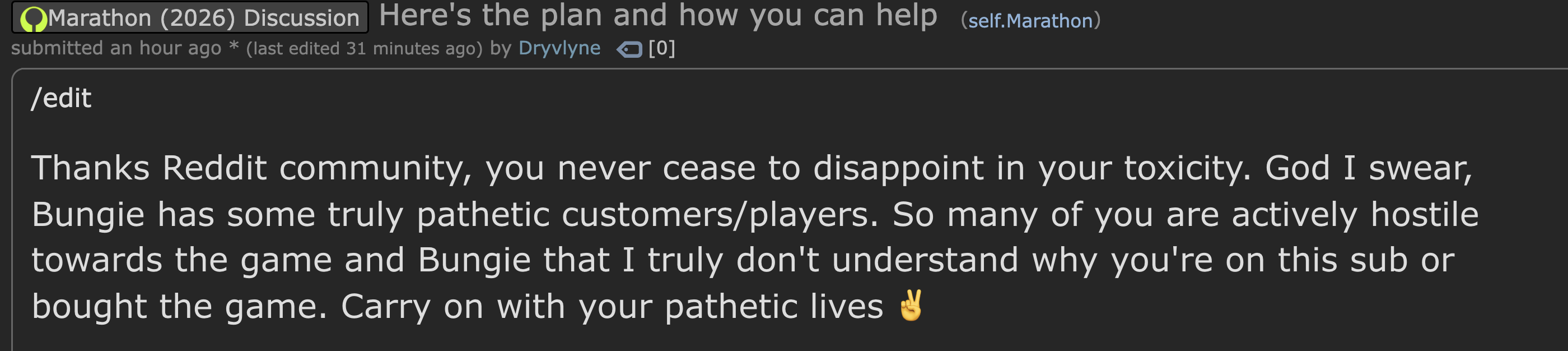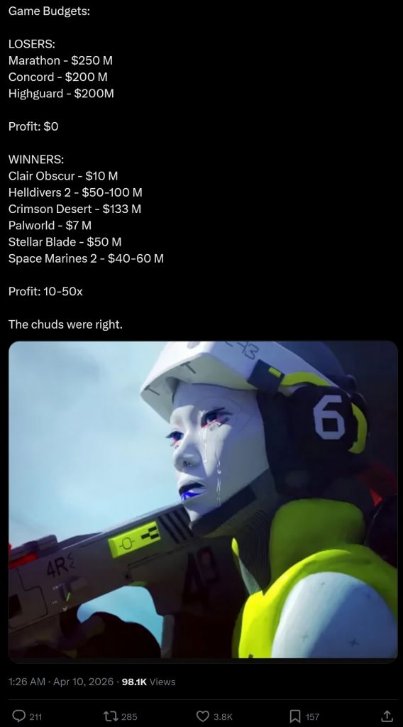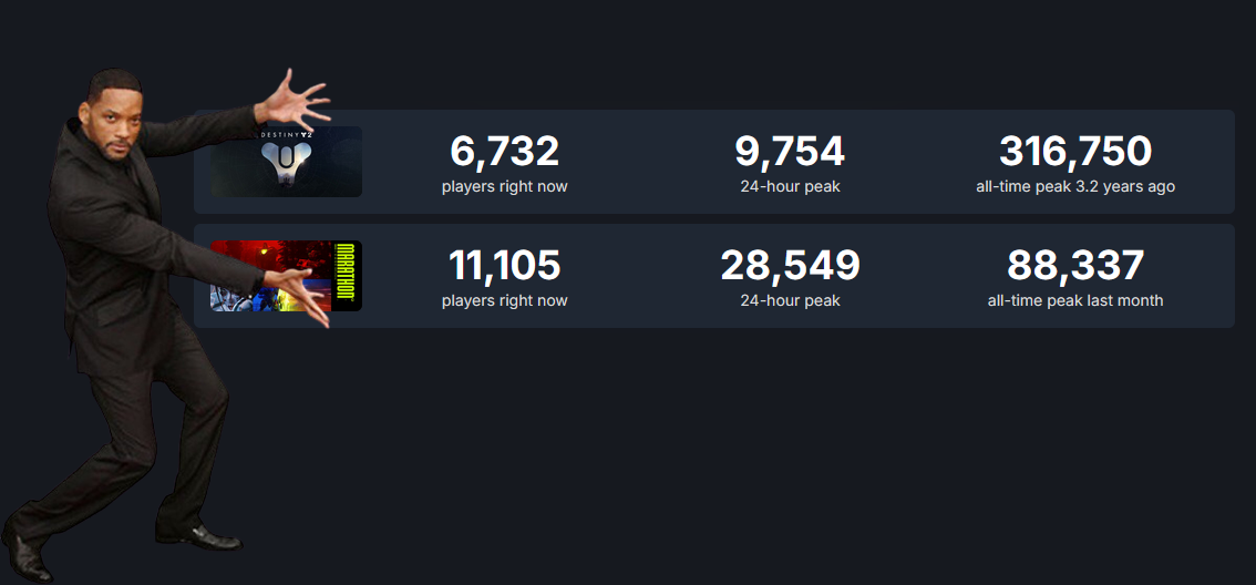 Thank God Marathon flopped. Say what you want about Destiny, but I sincerely never saw a lower effort product from Bungie.Maraflop and its reception is probably testing Bungie's game design philosophy right now; for a company was obsessed with analytics and not overdeliveringI'm sure their data team are having a very difficult time explaining why no one's playing this shit game.I really hope that Sony doesn't bend the knee and finance a forsaken level expansion, because quite frankly Bungie doesn't deserve a bailout this time.