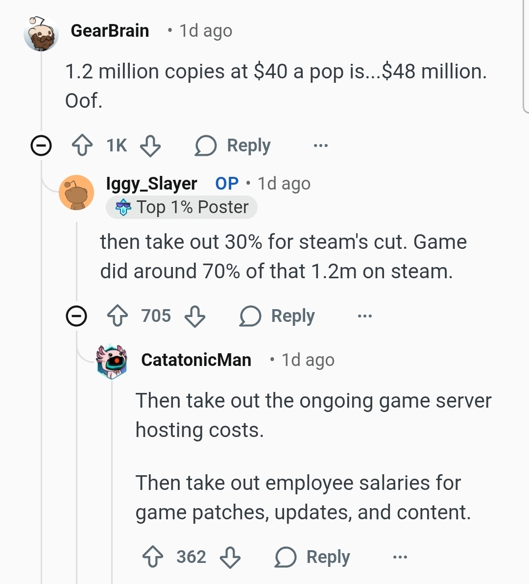 >>563203809How much do you think an American fulltime game developer makes living in a major tech hub? Take a guess then we'll do some basic maths together so you can understand the basics of how a company functions