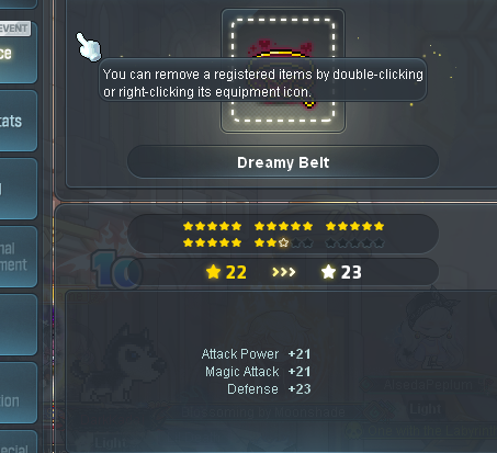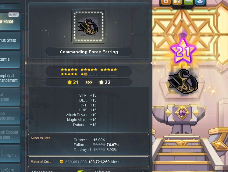 Manage to get gloves 18 to 21 and boots 18 to 20 without booming once. Guess I'll keep the spares until i get enough meso to try and 22 both, but i may just focus on doing the cape and shoulder 18->20/21 first. I'd tap boots to 21, but i don't have enough meso to get it back to 18 if it does boom.