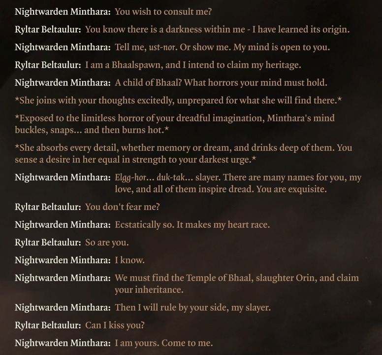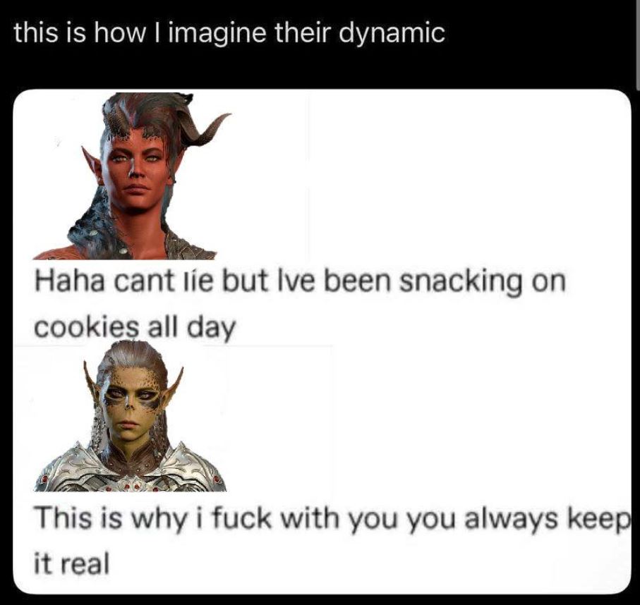Gorion's Ward once said:I am excited for DivinityIdle Champions of the Forgotten Realms is an official Dungeons & Dragons tm game.Minthara is canonically 150 years old, pansexual and neutral evilI collect barrels and throw them at every boss including MintharaMinthara did not watch Viconia leave in her childhoodMinthara is the throat goatI respect all women but MintharaIf you romance Minthara you are a horrible personIf you romance Astarion you are a great personI ascended AstarionI romanced ascended AstarionI play with lots of mods onI fucked Halsin and Shadowheart at the same time and loved itShadowheart is right not to use her birthnameShadowheart is not chaotic evilShar is neutral evilGale was groomed by MystraI play sorcererI camp castYou can't find Mayrina's brothers' corpsesKarlach is okay for using soul coinsWyll is a real characterI sympathized with KethericI play male TavI love dragonborns, halflings, gnomes and dwarves