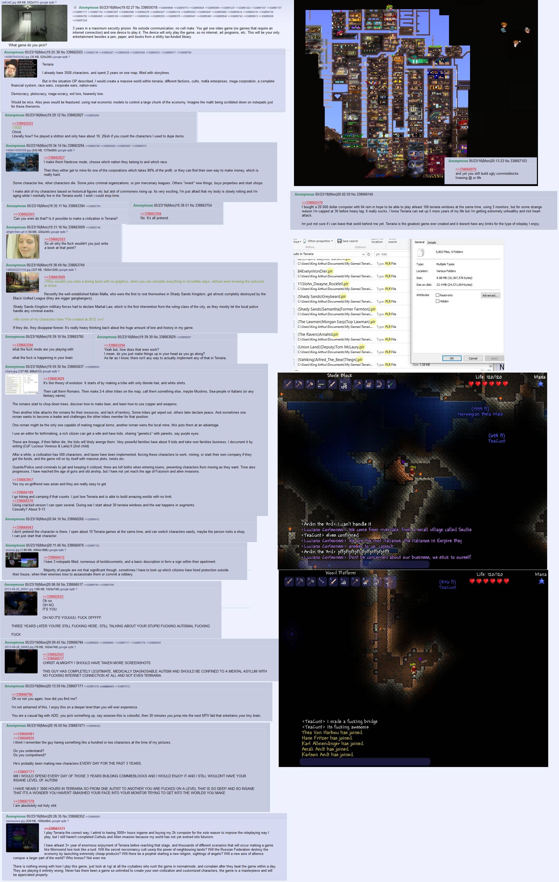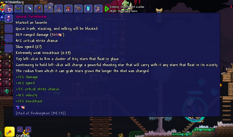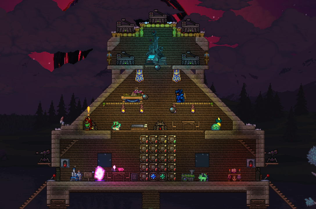 >>563338597On the plus side, I had alot of fun making my commie blocks livable. And admittedly I had some great bouts of fortune at the beginning of the run.>found the stylist, angler, goblin tinkerer and wizard less than 30 minutes after their spawn conditions were met>had amazing drop rates>got to have a little fun using items that calamity forgot to nerfOverall an 8/10 run.