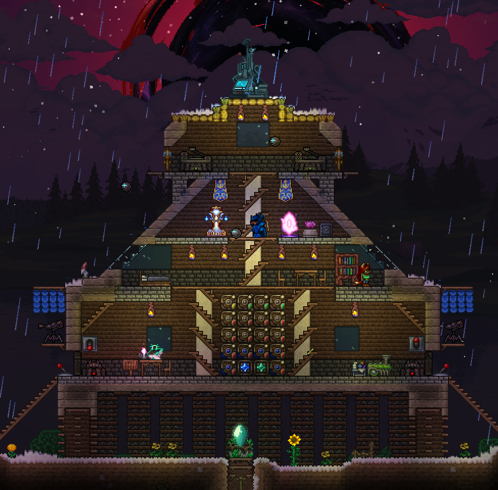 >>563254692Good good, I like these suggestions. Since I have a bed up there, I tried to experiment with a window that sort of merges with the side of the house, kind of like a skylight. If I ever see the damn sun again, it would be nice having that shine on you in the morning.I used a spiral staircase from a previous project, using white dynasty wood as the base for the pillar. Moved a bunch of crap I don't need anymore, did some work on the top of the house, got rid of the excess draedon power cell factories (because I don't even use his weapons anyway)