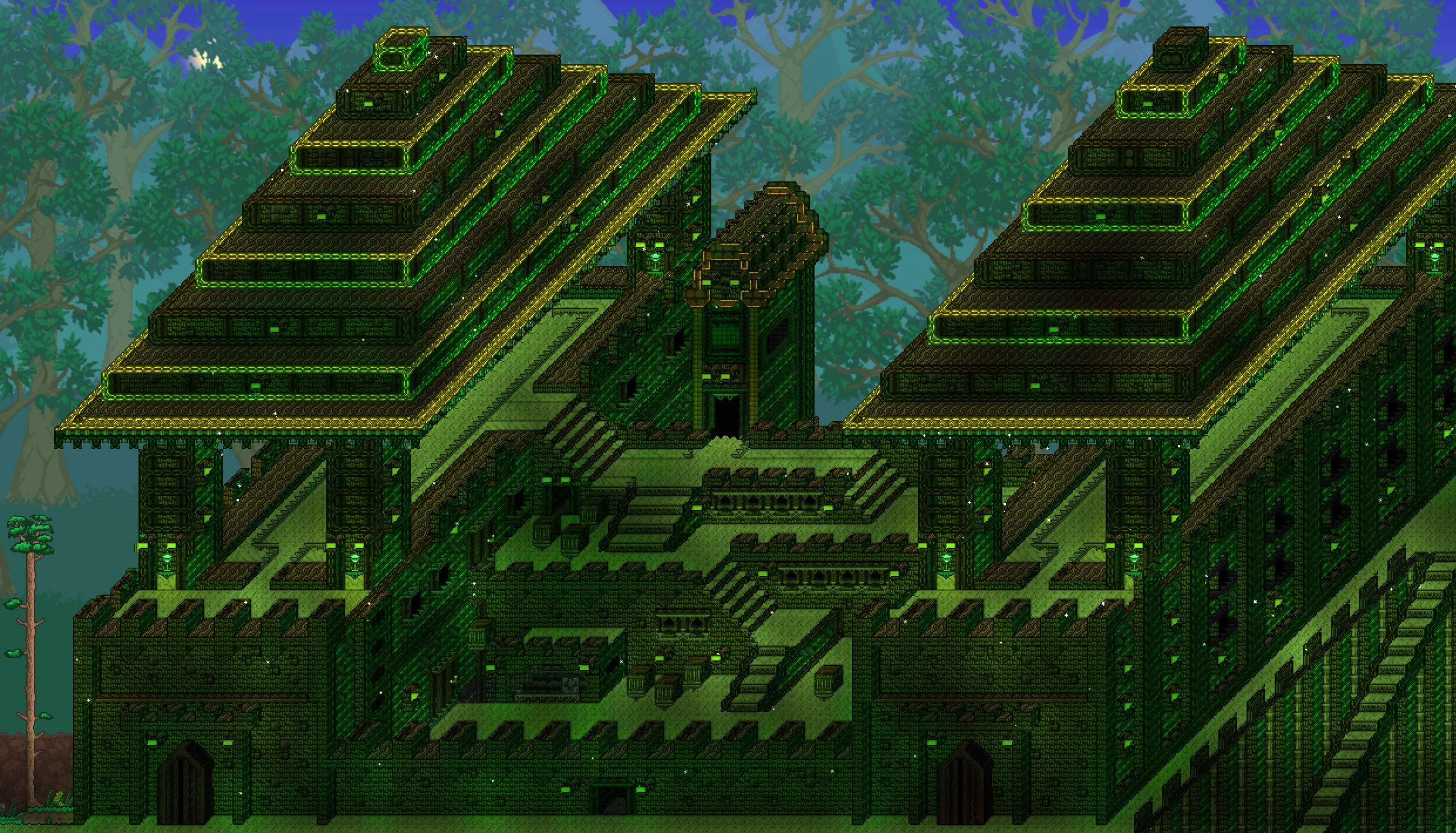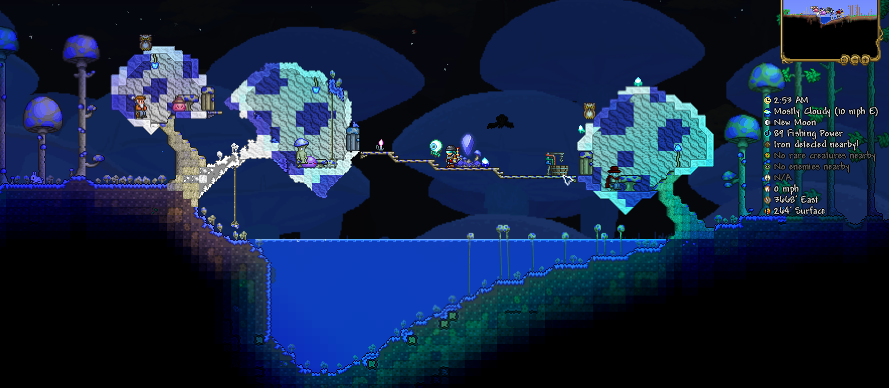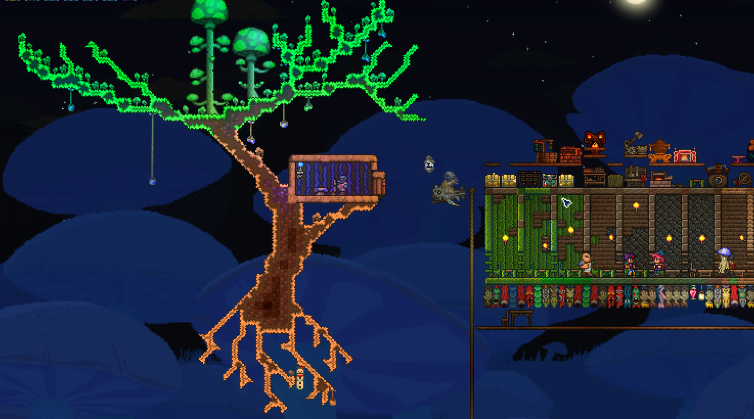 >>563452227that world is old but i kept playing on it for a few versions, i dropped it for another one when they revamped the desert and i only used it to store trash items and farm princess kills after that>>563452842another one of my mushroom biomes, i like the tree but i don't feel like it matches the biome aesthetic, it would work better with pink petals and living wood for some style building
