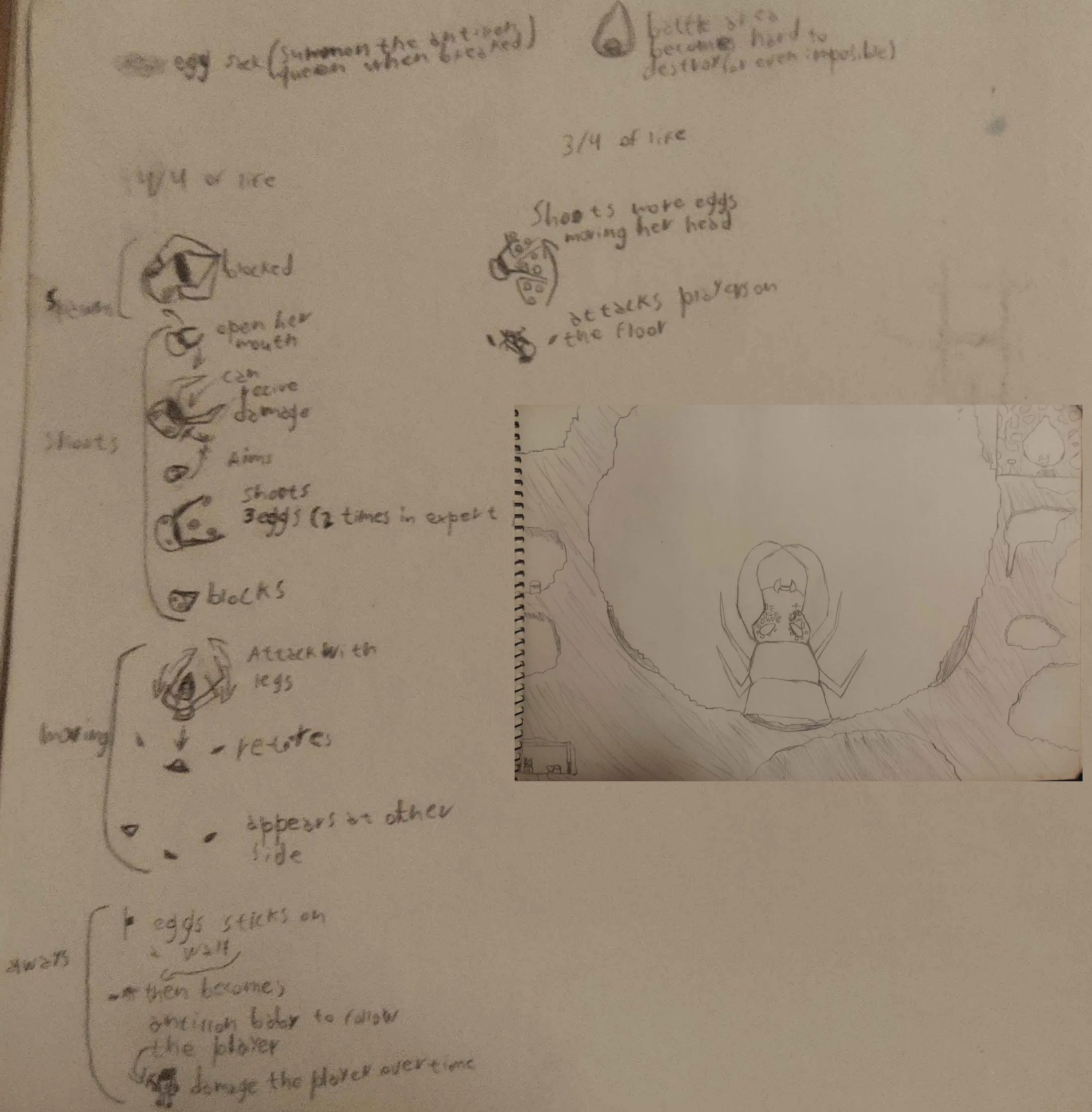 god damn i feel OLD, i was in high school when they revamped the desert and i was honestly disappointed that they didn't add an antlion queen boss so one day when i was bored in class i sketched a mockup, english is my second language but terraria's translation was so dogshit back then that i wrote my ideas with some very obvious ESLisms.i think the main idea was to have an arena shaped like a pit where quicksand dragged you to the middle (think of conveyor belts that make jumping harder) like how an actual antlion would hunt other bugs
