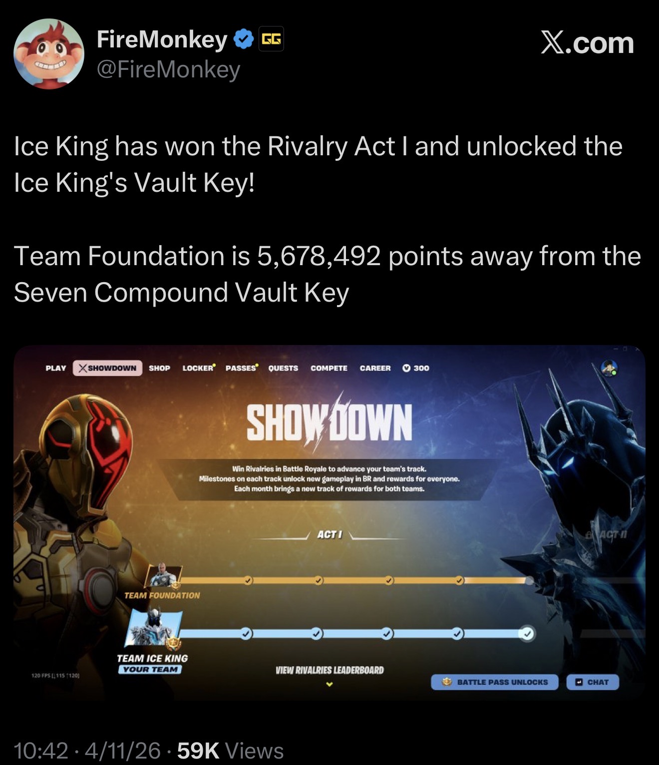 >Fortnite Chapter 7 Season 2: Showdown | Official Launch Trailerhttps://www.youtube.com/watch?v=e4sCLYMSokg>Fortnite Chapter 7 Season 2: Showdown | Cinematic Trailerhttps://www.youtube.com/watch?v=m-c_3degE60>Showdown in the New Fortnite Battle Royale Seasonhttps://www.fortnite.com/news/showdown-in-the-new-fortnite-battle-royale-seasonhttps://showdown.fortnite.com/en-US/>Fortnite Chapter 7 Season 2: Showdown | Cinematic Recap Trailerhttps://www.youtube.com/watch?v=KIlnglVOuG0>Quests, stats, shophttps://fortnite.gghttps://fortnite.gg/statshttps://fortnite.gg/shophttps://www.fortnite.com/item-shop>Season XP Leveling Pacehttps://www.fortnitexp.net/>Mission Alerts for StWhttps://freethevbucks.com/timed-missions/https://fortnitedb.com/>Save the World Goes Free-to-Play April 16https://www.fortnite.com/news/fortnite-save-the-world-goes-free-to-play-april-16>Fortnite V-Bucks Price Increasehttps://www.fortnite.com/news/fortnite-v-bucks-price-increase>Chappell Roan Rides into Festival for Season 13!https://www.fortnite.com/news/chappell-roan-the-midwest-princess-rides-into-fortnite-festival>Master Your True Potential in LEGO® Fortnite Odyssey’s NINJAGO® Updatehttps://www.fortnite.com/news/master-your-true-potential-in-lego-fortnite-odysseys-ninjago-update>Fortnite Crew April 2026 - Sakarahttps://www.fortnite.com/fortnite-crew-subscriptionPrevious: >>563144269