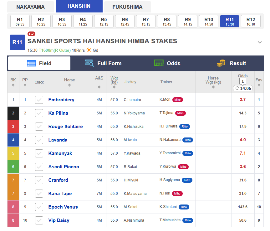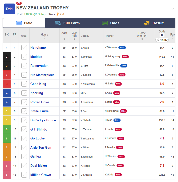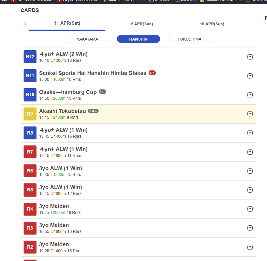 >>563258413G2 New Zealand Trophy, Nakayama, 1600m Turf, Good, 3YO only, Trial for G1 NHK Mile Cup (15:45 JST)1. Sire side - Grass Wonder; Dam side - Narita Top Road2. Dam side - Symboli Kris S3. Dam side - Jungle Pocket4. Sire side - Grass Wonder5. 6. 7. Sire side - Cesario, Special Week8. 9. Dam side - Epiphaneia, Cesario, Symboli Kris S, Special Week, Agnes Tachyon10. Sire side - Orfevre, Stay Gold, Mejiro McQueen11. Sire side - Kitasan Black, Sakura Bakushin O12. Dam side - Maruzensky13. Dam side - Stay Gold14. Sire side - Fuji Kiseki15. Sire side - Special Week; Dam side - Jungle Pocket