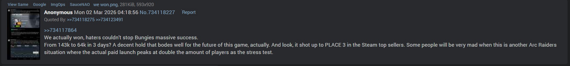 >>563251452>people are roasting aztecross in his own comments for apparently saying that Marathon would retain over 100k players for at least 6 months before releasePeople here were saying it was going to beat Arc, or have over 100k players on launch.lel