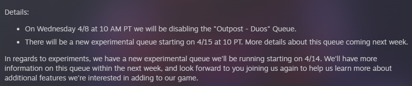 I like how Bungies solution for removing the already existing (and flourishing) experimental duo queue, was to remove it for the next two months and say they need more time to refine it. Do they really think people are going to find thirds or fill until June? Fuck off. There's no reason to do this, might as well just quit.
