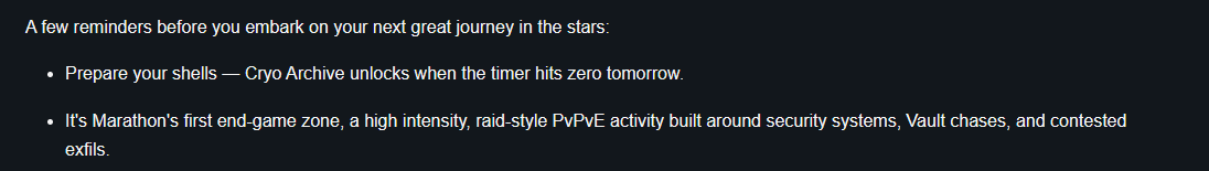 The Doomed Doomer Edition>Marathon Youtube Channel: https://www.youtube.com/@MarathonTheGame>Game Info:https://store.steampowered.com/app/3065800/Marathon/>Marathon Game Home Pagehttps://www.marathonthegame.com/>The Entire History of Marathonhttps://www.youtube.com/watch?v=yu7uN6-lNhk [Embed] [Open] [Embed] [Open]https://marathon.bungie.org/story/>Play the Original Marathon for Freehttps://store.steampowered.com/app/2398450/Classic_Marathon/Databases:https://tauceti.world/https://tauceti.gg/https://marathonmeta.gg/https://marathondb.gg//vg/ Discord:https://discord.gg/RDy8sPCeKcNews:>Experimental Queue coming Wednesday 4/15 at 10 am PT>RECENT PATCH NOTEShttps://www.bungie.net/7/en/News/Article/marathon_update_1053>SEASONS & ROADMAPhttps://www.bungie.net/7/en/News/Article/introducing_seasons_marathon>MARATHON OST VOL. I & II OUThttps://music.youtube.com/playlist?list=OLAK5uy_n3mqJXB_rxXOGplviv8tGdXtHDdL9grK4https://music.youtube.com/playlist?list=OLAK5uy_k_FhqMdjI4UChXwooy0VROM84xgCi8JM0>RANKED DETAILShttps://x.com/TauCetiGG/status/2033929468713308638>CRYO ARCHIVE DETAILShttps://www.bungie.net/7/en/News/Article/cryo_archive_overviewPrevious Run >>563105596