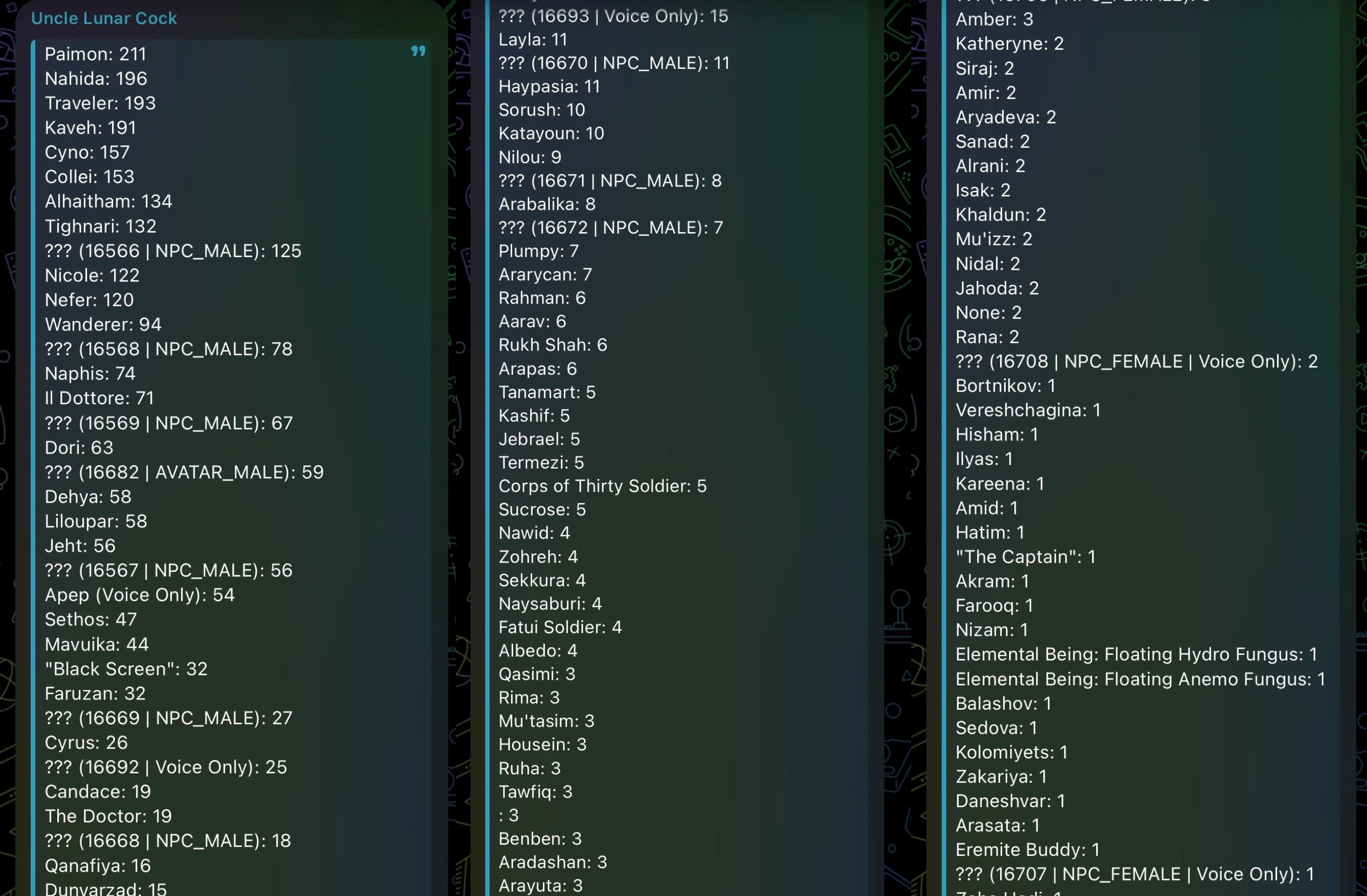 Dottore only has a dialogue with ID16569 who is NPC_male and has 67 lines so either its Pantalone and Lunar Cock is wrong or ThothWho the fuck is NPC male with 125 lines then