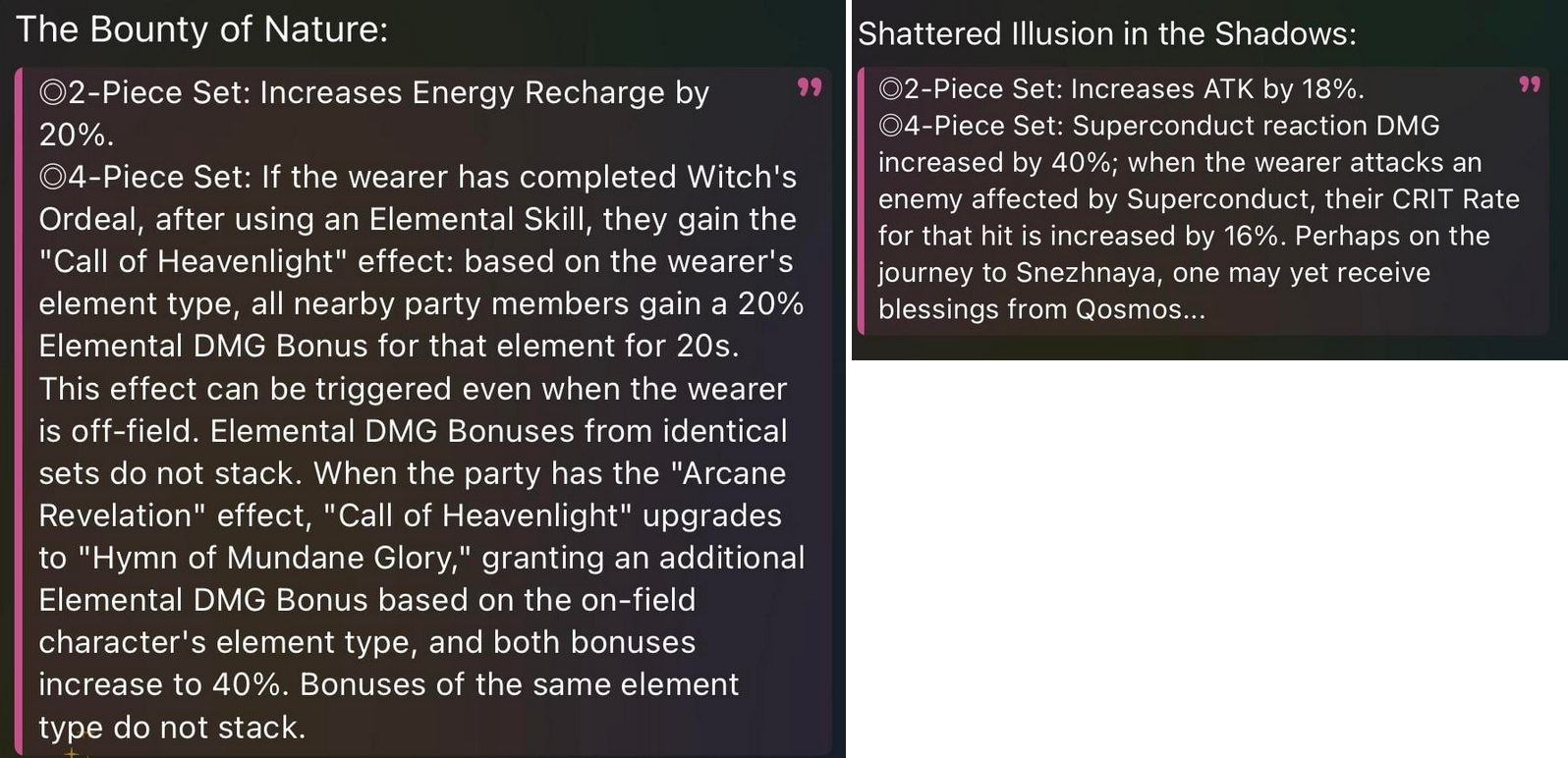 >>563265096Hexerei got a cinder clone to buff 20-40% elemental%Superconduct got some shitty dps set (though it's missing some effects that'll be added when sandrone is in to add the new reaction). Even if the effect doubled the atk/crit it would still be worse than other dps sets desu