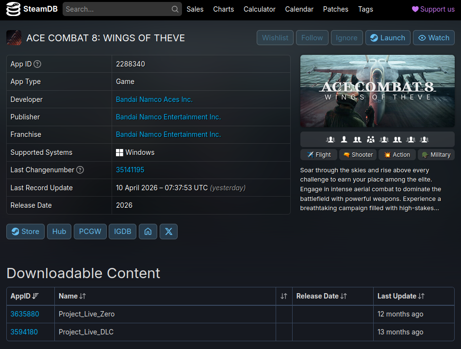 >>563277225I don't see why SteamDB would have mentions of an Ace Combat Zero executable and Ace Combat Zero DLC if there wasn't something Zero-related coming.