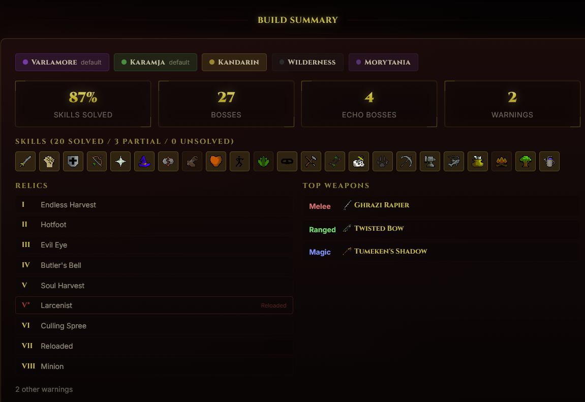 >>563260908the planner site is retarded>pick wildy, kandarin, zeah with woodsman>farming and herblore are "unsolved" despite thousands of secondaries from wildy bosses and thousands of seeds and herbs from woodsman / hunter contracts>cooking is "unsolved" because i'm apparently not going to train fishing, ever>construction is "unsolved" despite callisto shitting out thousands of mahogany logs and kandarin having access to butler>recommends that i spend 46m GP on building 4,600 elemental balanceshmm yes of course