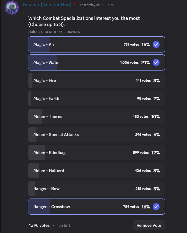>>563368604max contrarian build right now is thrown weapons (160 votes)fire and earth builds got less votes but people won't know you're a snowflake if you go Kandarin anyway