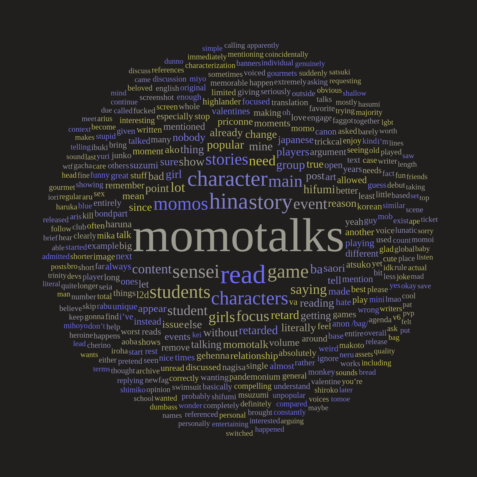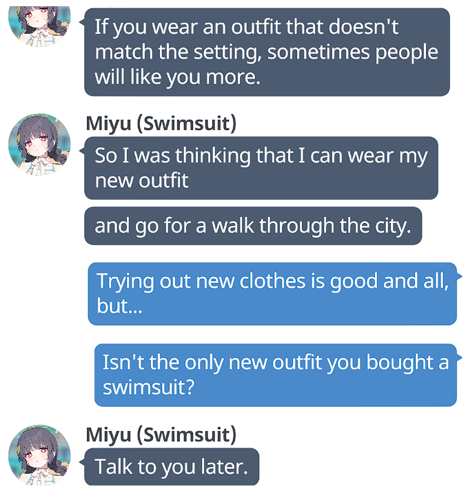 >>563291339I didn't bring up time gating, you did. And I'm not sure why.I just said a lot of people don't read momotalks >>563290759