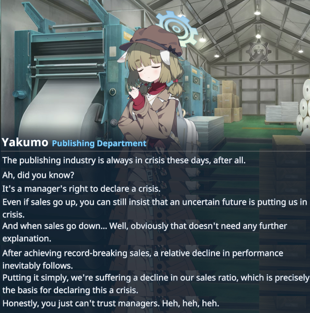 >>563289505>indistinguishable from any other part of the gameSaid as if this is a bad thing, I guess, because it's like "any other thing in the game" has 0 opportunities for Sensei and 1 student alone time. Like is the logic here supposed to be that main stories should never have sensei be alone with a student, because it's thus indistinguishable from a momotalk? So like, erase the start of volume 5 chapter 1 because it's basically a Yukari momotalk, and that's content cannibalism