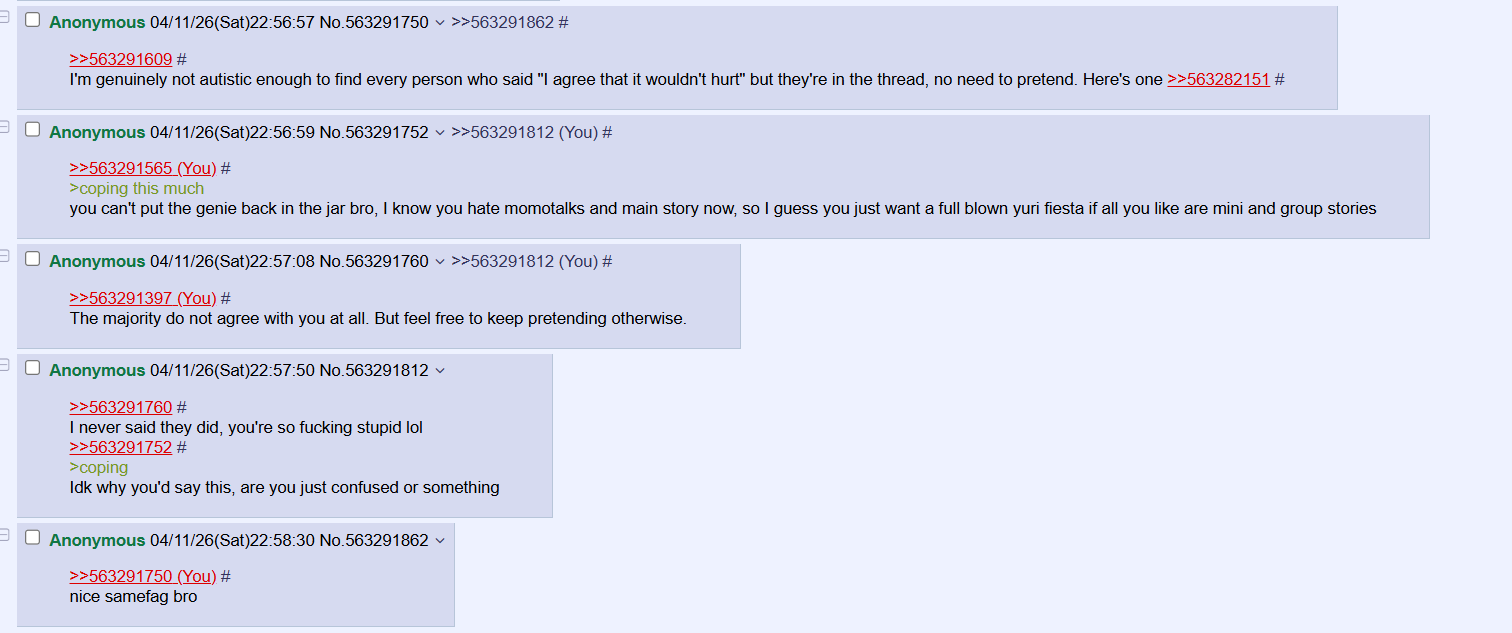 >>563291565>coping this much you can't put the genie back in the jar bro, I know you hate momotalks and main story now, so I guess you just want a full blown yuri fiesta if all you like are mini and group stories