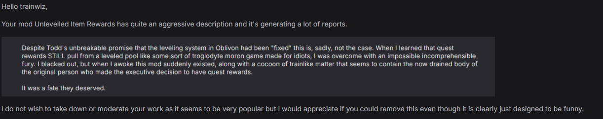 >>563308234Remember that LOTD is supported by reign of the shitpins and his retarded forever free broken ass modsmainly >pic related and his stendarr's hammer replacement who were ungodly broken and crash prone with him ignoring feedback>>563308382Get fucked leilellol