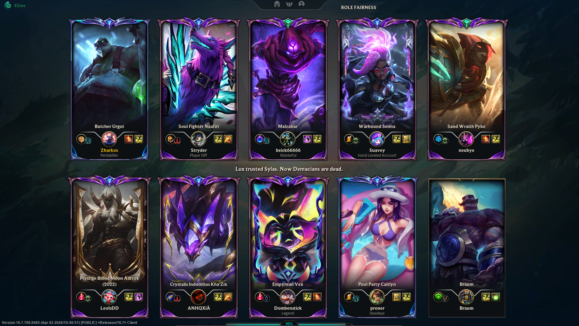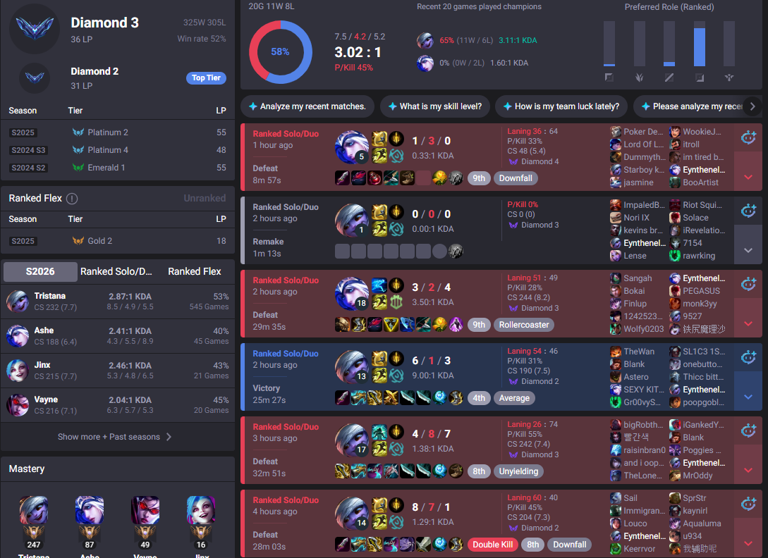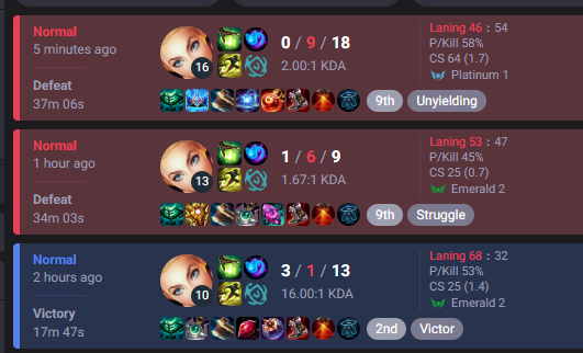 every normal game lately is a combination of you finding the same players game after game day after day, half of the lobby being lv20 accts with 80% wr and the whole game being a coinflip on who gets the banned smurfs making their 30th account of the month sweating their minds off and bming the enemy team and being as much of a nuisance as possible or the incorrectly flagged as a smurf new player or person trying a new champion for fun who wont stand a chance capped by you being added by a bot every other game and people telling you the smurfing problem doesnt existjust like the botting problem doesnt exist ig