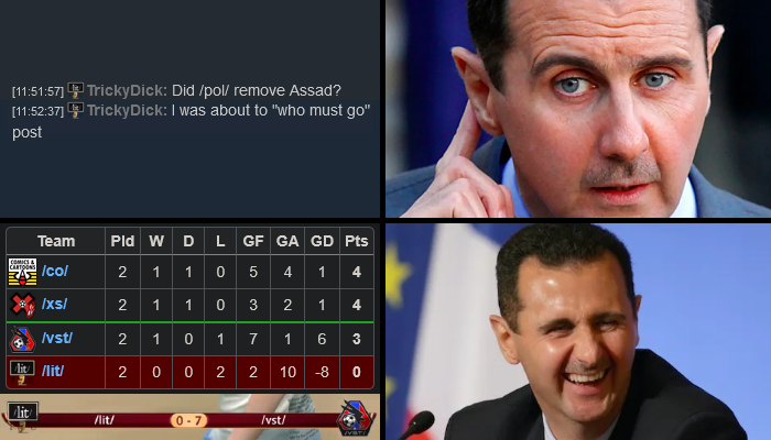 Previous: >>563197804>What... is this?Put simply, a simulation of Pro Evolution Soccer being competed between teams which are embodiments of boards of the 4chan imageboard. The players represent facets of each board's culture. All of the matches are AI versus AI. However, humans "manage" each team, creating their tactics and giving input during games as they happen to make substitutions and tactical changes as they see fit.https://implyingrigged.info/wiki/FAQ>Where can I watch the cup?https://isthisliv.com/4cc/stream.html>Ongoing Cupshttps://implyingrigged.info/wiki/2026_4chan_Spring_Babby_Cup_Qualifiers>Upcoming Cupshttps://implyingrigged.info/wiki/2026_4chan_Spring_Babby_Cuphttps://implyingrigged.info/wiki/2026_4chan_Summer_Cup>Upcoming Invitationalshttps://implyingrigged.info/wiki/2026_4CC_Champions_Leaguehttps://implyingrigged.info/wiki//ag/_League_9/11:_Never_Forgethttps://implyingrigged.info/wiki//jp/_League_1https://implyingrigged.info/wiki/Very_Genuine_and_Legit_Vidya_Game_Leaguehttps://implyingrigged.info/wiki/Beta_Bowl_4>Wiki:https://implyingrigged.info/wiki/Main_Page>Sekkrit Code37pebis>DLC Passworddivegrass>Booruhttps://isthisliv.com/booru/>Archivehttps://implying.fun/>Other videoshttps://implyingrigged.info/wiki/Videos>PES Infohttps://implyingrigged.info/wiki/Pro_Evolution_Soccer_2015https://implyingrigged.info/wiki/Pro_Evolution_Soccer_2021>Previously:/lit/ dedVGL shitposting.exe fuckery