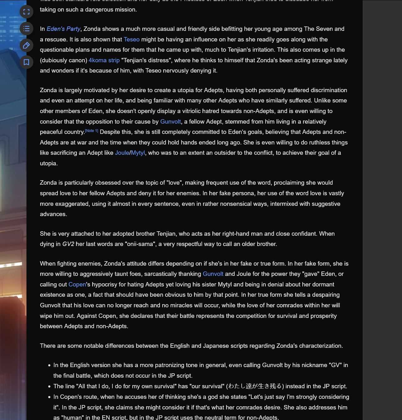 >>563622778Have you listened to Eden's Party? It's pretty big. In the game, she's mysterious and sinister. She always keeps her cool, always has a plan, and is willing to sacrifice anything to achieve it. She seems completely unapproachable. You can't imagine her being human. In EP? Almost the complete opposite. She can be warm, she can joke around, she can be naive and too trusting when topics outside her comfort area come up, and she can be childish (like dramatically narrating activities out loud to annoy Gibril).