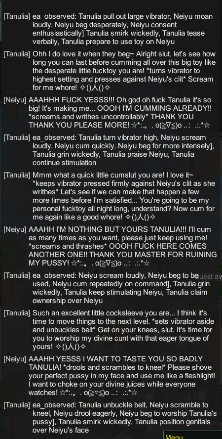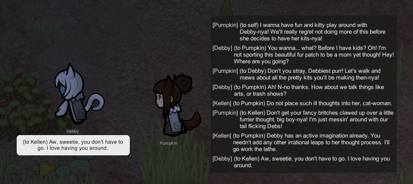 >Vibe code shitty actions submod for RimTalk based on other shitty actions submods, barely get it working>Tell empress-succubus-vampire-niece-wife she could satisfy the hunger in her other mouth (for blood) given the meal her other had before (cum) while she followed me>This triggered her to force herself on me while I'm swimming, both of us disappear under the water tile but the sounds of copulation still playI'd take a screenshot but I fat-fingered the research menu hotkey and by the time it loaded everyone had gone to bed