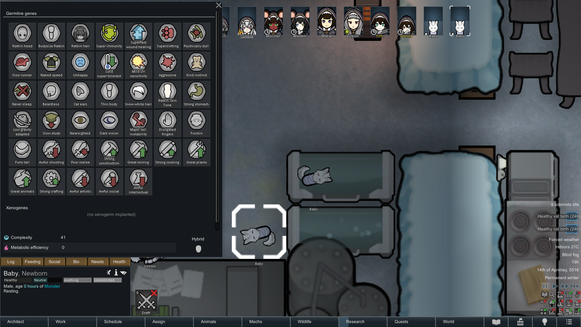 >>563357789well... the embryo had 2 different skin colors, but the baby was born with the one both parents had (not sure if it's rng or just takes that as the dominant one or something).Now I got my embryos ready when I need slave replacements. It took a lot of try and errors, but managed to put together the genes I wanted (sadly I have no xeno with weak melee damage, which I also wanted so the slaves wouldn't be an issue to control).