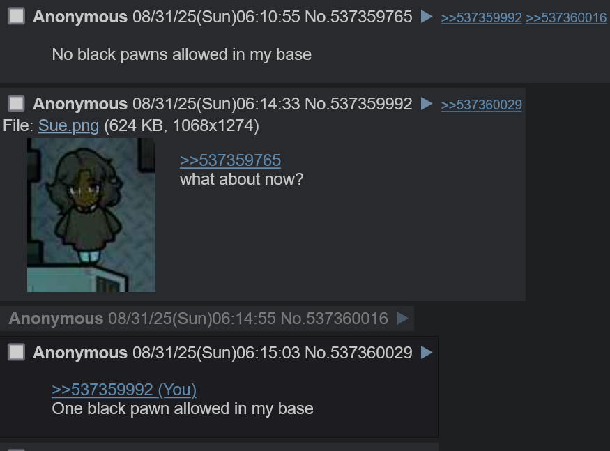 >>563383569Black female pawns are allowed as long as they are sterilized.
