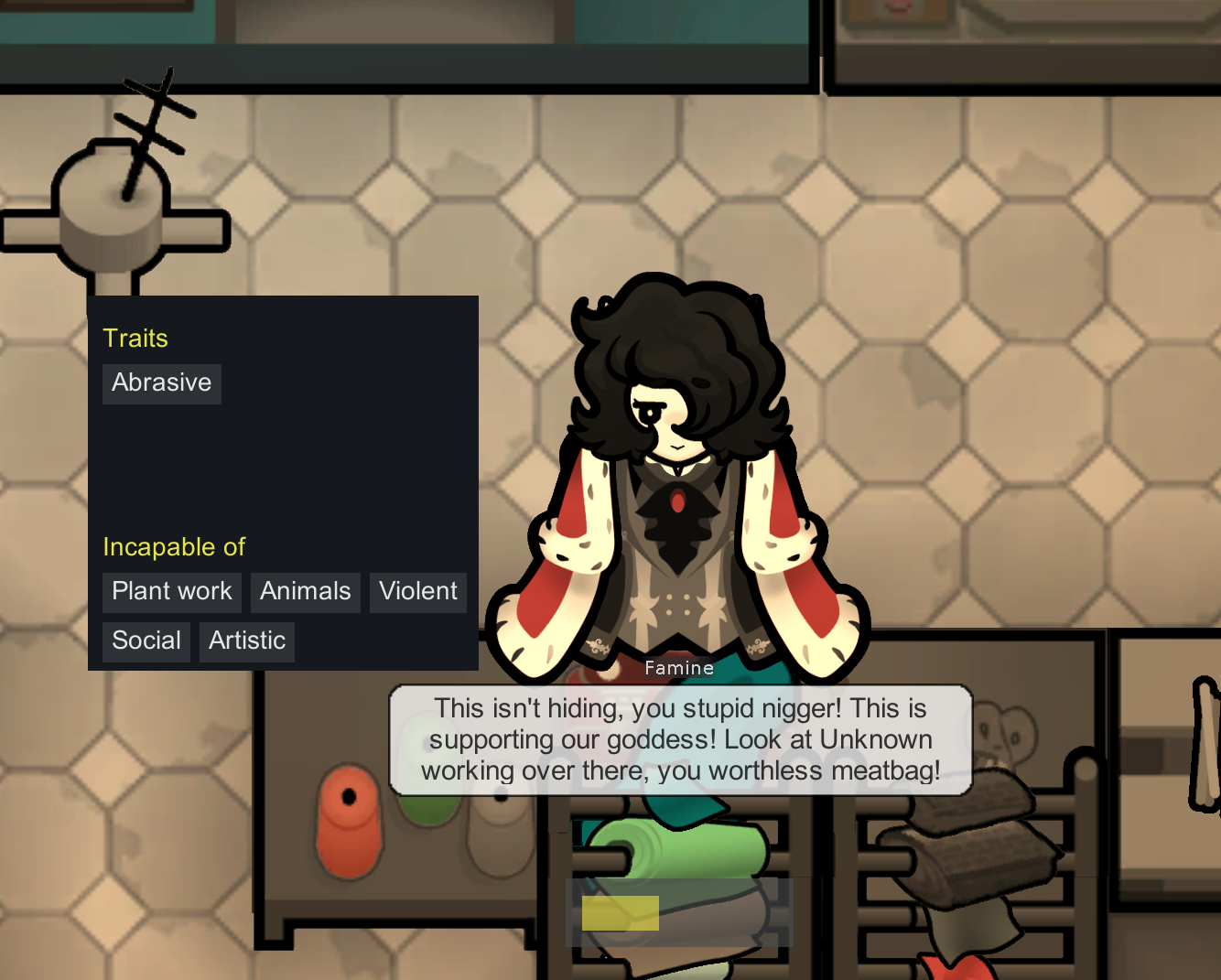 >no Gamers meme>increased recreation use, gain increased mood from recreation>gets bored faster, needs multiple recreation types>new ritual - LAN party (requires computers)>new ritual - game night (new buildable which is a table that functions as an altar and can be surrounded by chairs>new moodlet - Loser (loses/fails at too many games too frequently - randomly assigned to your pawns every time they use recreation)>new moodlet - Winner >new trait - Good sport (negates loser moodlet, prevents negative social to winners)>new trait - Bad sport (intensifies loser moodlet, HATES winners which is -social to pawns that are winners)HOW IS THIS NOT A THING ADD IT /RWG/