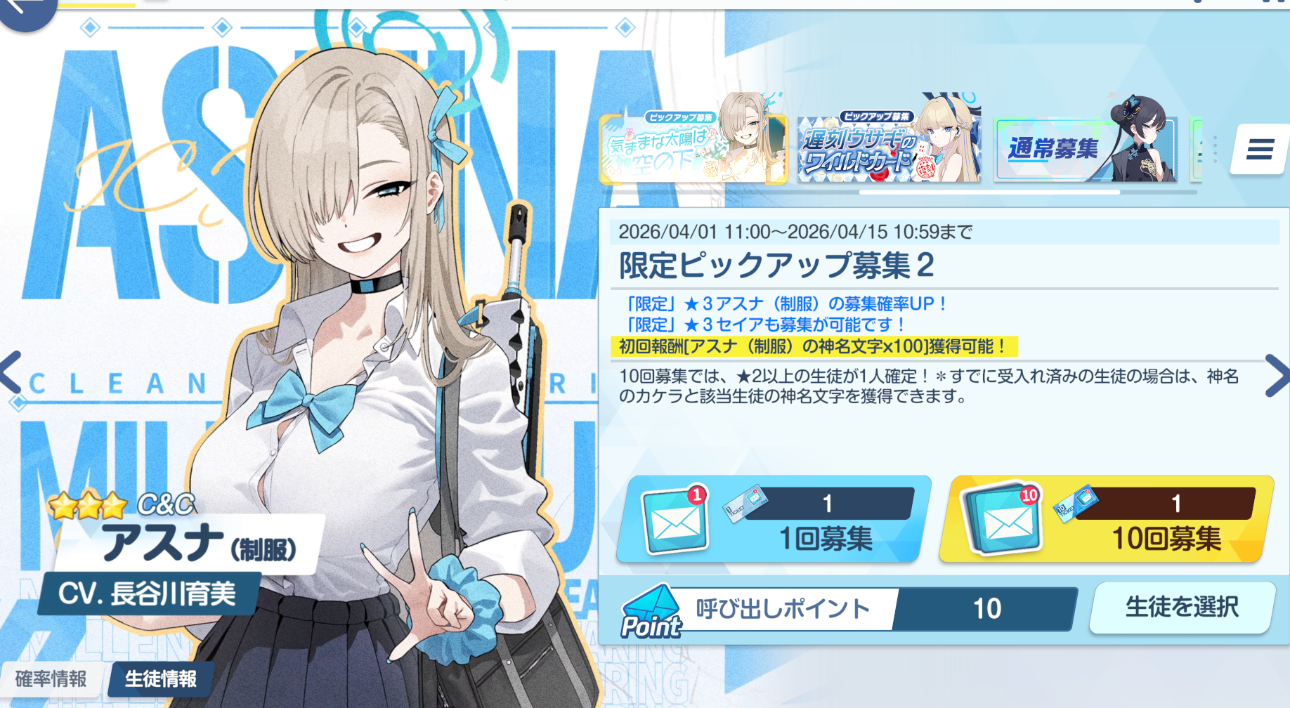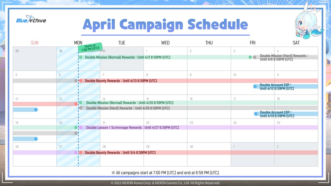 Previous Thread: >>563365842>Guides, Resources and useful links:https://rentry.org/bagguides>/bag/Circles/Clubs/Friends:https://rentry.org/holdingthebag>4koma, Manga, Side Content, PVs & Shortshttps://rentry.org/bacontent>>(JP) – JST>Banners:>4/1 After Maint – 4/15 10:59Akane (School)Seia (Limited)Asuna (School – Limited)Karin (School – Welfare)Toki (Bunny)>News:Patch notes: https://bluearchive.jp/news/newsJump/645>Events:Code: BOX - The Shadow Approaching Millennium – 4/1 After Maint – 4/15 10:59Balancing Schale's Books with the General Student Council – 4/15 11:00 – 4/21 10:59>Content:Grand Assault: Perorodzilla (Field – Torment w/Heavy & Special Armor) – 4/8 11:00 – 4/15 3:59Limit Break Assault: Tiphareth (Indoor – w/Elastic Armor) – 3/19 11:00 – 4/21 3:592x Hard – 4/8 4:00 – 4/15 3:592x Commissions/Bounty – 4/15 4:00 – 4/21 3:59>>(GLOBAL) – UTC>Banners:>4/7 After Maint – 4/21 1:59TakaneYakumoMeru, MomijiMinoriShigure (Hot Spring)Serika (Swimsuit)>News:Patch notes: https://forum.nexon.com/bluearchive-en/board_view?thread=3415801>Events:Winter Sky's Renaissance: Thesis on Cultural Exchange – 4/7 After Maint – 4/21 1:59My Office: https://bluearchive.nexon.com/user/myoffice>Content:Total Assault: Kurokage (Urban) – 4/7 After Maint – 4/13 18:59Joint Firing Drill (Breakthrough) – 4/14 2:00 – 4/20 18:59Limit Break Assault: Chokmah (Field – w/Heavy Armor) – 4/8 2:00 – 4/27 18:592x Bounty – 4/6 19:00 – 4/13 18:592x Account EXP – 4/10 19:00 – 4/12 18:592x Normal/Hard – 4/13 19:00 – 4/20 18:592x Account EXP – 4/17 19:00 – 4/19 18:592x Lesson/Scrimmage – 4/20 19:00 – 4/27 18:592x Bounty – 4/27 19:00 – 5/4 18:59