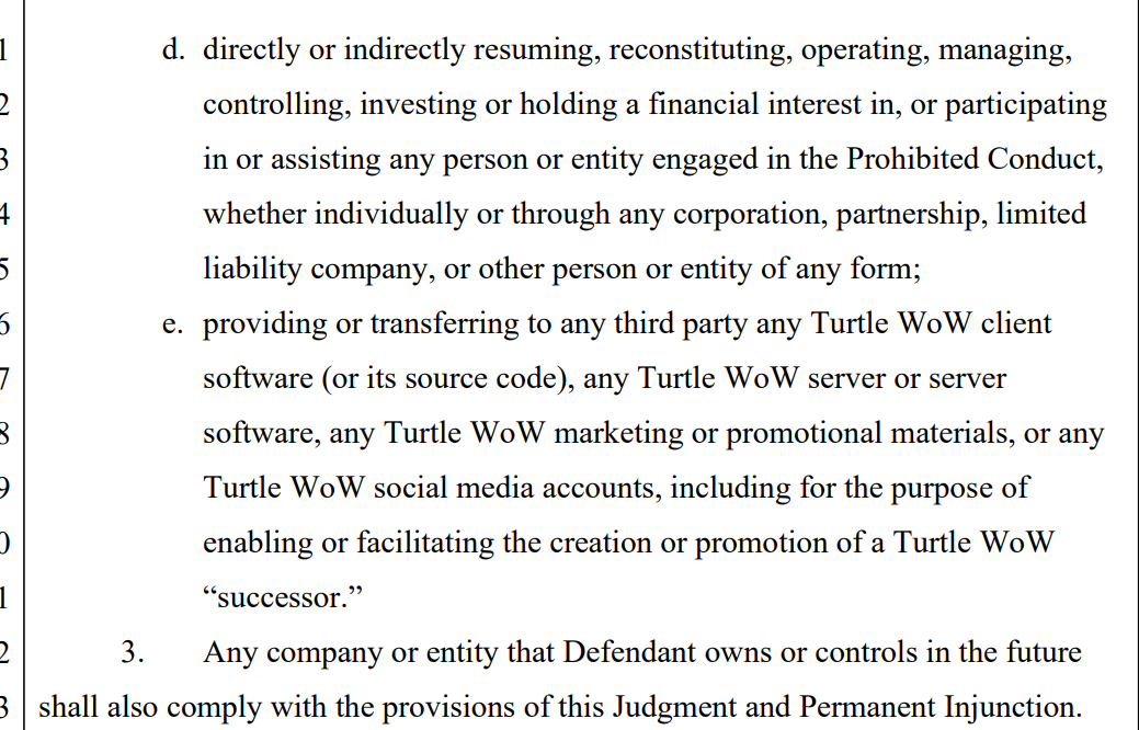 >>563440801Please read again my first post I will repost it here in different phrasingBlizzard was not able to find the actual owners of turtle wow, they sued American and presumably European staff members who are not the owners of twoThe court ordered these people stop everythingShenna still owns the source codeShenna is not beholden to the courtIf shenna kicks out all her staff and keeps the source code the courts cant say "oh we meant you had to kill shenna so she wouldn't do this"