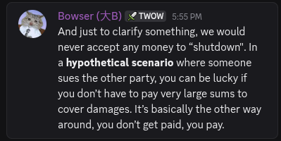 >>563438126This would still break the settlement.If you look at the settlement agreement Turtle Wow has agreed they won’t transfer ownership. If the source code got leaked now even that would violate their agreement.Basically giving it to new owners would be the exact same for Shenna legally as continuing to operate the server.