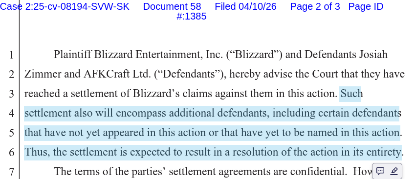 >>563441043actually AFKcraft, the HK based shell company behind Turtle WoW, agreed to the terms while representing everyone>>563441112see >>563417137