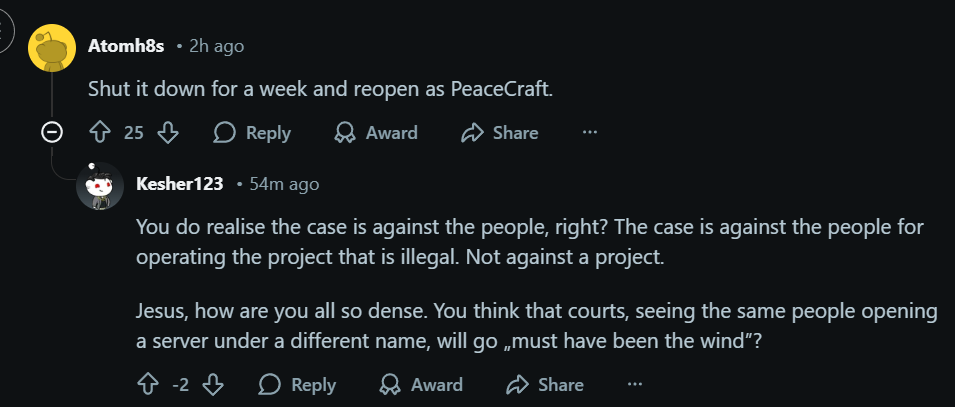 >"AAAAIIIIEEEEE WHAT DO YOU MEAN YOU CREATED SOMETHING THAT PEOPLE ACTUALLY LIKE?!?! GO GO LAWYERS SHUT THESE CH-CHUDS DOWN!'>"WE DID IT! WE KILLED A SMALL GROUP OF DEDICATED FANS! NOW PEOPLE WILL COME BACK TO OUR REAL GAME WITH GAY TROLL RACES AND HECCIN WHOLESOME CHUNGUS STORYTELLING"