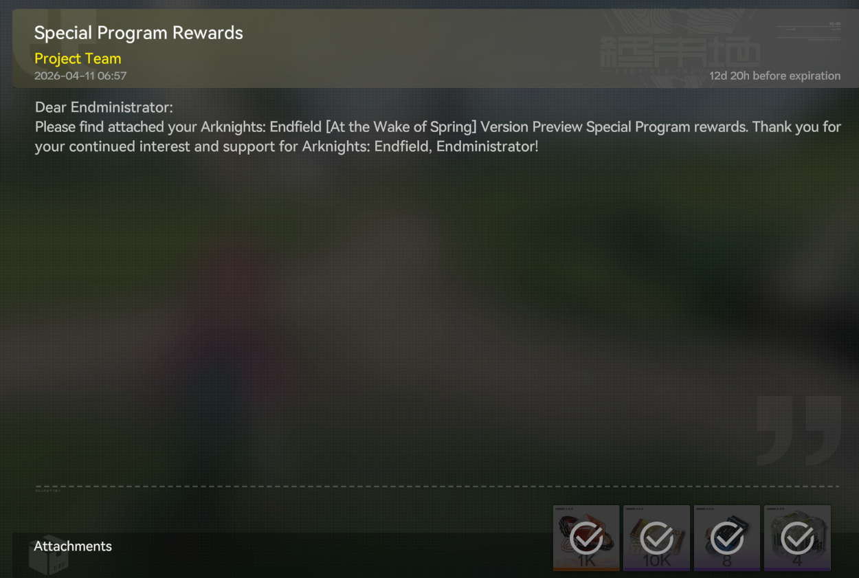 Previous: >>563387378>[4/11 19:30 (UTC+8)] "At the Wake of Spring" version preview livestreamhttps://www.youtube.com/watch?v=tMFGowIF8eA >Official Websitehttps://endfield.gryphline.com/en-us>Official EN X (News)https://x.com/AKEndfield>DEV Comm (Developer Updates)https://endfield.gryphline.com/en-us/news/2662>Rossi PVshttps://www.youtube.com/watch?v=A5C7-5vi9SM https://www.youtube.com/watch?v=mwF4cJn6ekA >Rossi EPhttps://www.youtube.com/watch?v=0xecf5km_gYhttps://www.youtube.com/watch?v=cXch8i1Bxz8https://www.youtube.com/watch?v=aq3U6cI24Ek>Chartered Headhunting ScheduleMarch 29th to April 14th --- "Wolf Pearl", Rossi>SKPORT Daily Sign-inhttps://game.skport.com/endfield/sign-in?header=0&hg_media=skport&hg_link_campaign=tools>Twitch Dropshttps://endfield.gryphline.com/special/third-party-binding?channel=twitch>Reward CodesENDFIELDGIFTENDFIELD4PC>Wikishttps://wiki.skport.com/endfield (Official)https://perlica.moehttps://warfarin.wiki/enhttps://endfield.wiki.gg/>Blueprint Guideshttps://talospioneers.com/en>Stickershttps://drive.google.com/drive/folders/13KH3L6QPIKkVH7pBddv4uxwmwJsnOtklhttps://drive.google.com/drive/folders/1OuVtjv1k-9c3M6n7d4PX3CGG5bkwH04ahttps://drive.google.com/drive/folders/1AStB8bzFk3lSwMwczWPkFYCBrZe0vHOghttps://drive.google.com/drive/folders/1yS0lqUhxf8tBRtpDFfCU1y16IS2sSeF7>Fri/end/sSubmit your info, /end/min:https://forms.gle/Fo7BhZMKaKqiWyL19View other /end/mins:https://docs.google.com/spreadsheets/d/1YtxiDss0hgEQhLlZgpfzyGrJrzUcqDzOS9T6IH-BiVc/edit?usp=sharing