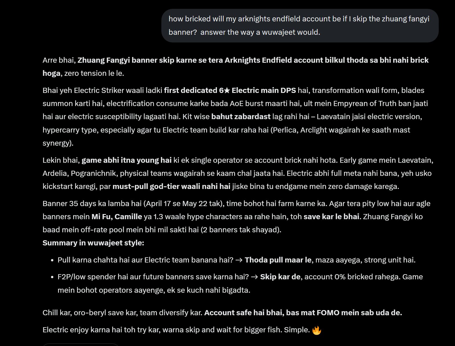 >ult dependent sustained dps brick in a burst gamethere's gonna be so much fangyi buyer's regret lmao. Genshin learned this lesson a long time ago about how to keep characters fun to play in short fights/overworld content, and now most character damage comes from skills with very short setup times. Ults are either supplementary single hits or support, and tend to have various ways to bypass the energy system and cheat them out.