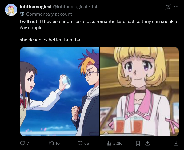 I have a crazy idea. Just hear me out guys. Please hear me out and give me your in depth thoughts on my idea I just made right now. I value your opinion.What if they build up a dynamic between Hitomi and Tomoro. Nothing explicitly romantic but enough to make you think "Yeah those two are definitely going to date when they get older". Maybe even have a movie where one of the conflicts is the dynamic between them. Give them something to argue about that is so petty that it feels like there must be some kind of romantic undercurrent, wouldn't that be cute?Then we have a timeskip series after Beatbreak and then have Hitomi confess that the person she loves is Raito and then she marries Raito and has kids with him and Tomoro is married to his offscreen wife probably his sister.