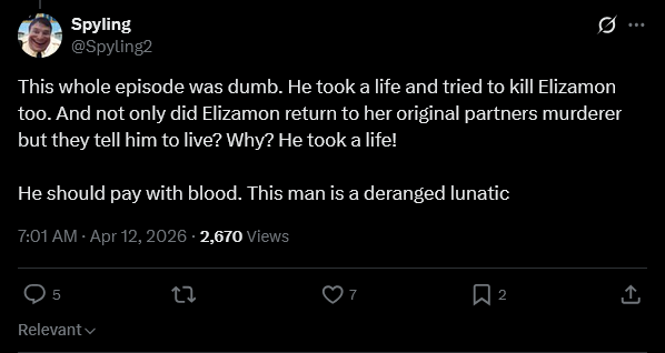 Yesterday's episode was poorly written. Establishing that Elizamon's original owner was murdered is a bridge too far and now I can't take the characters seriously anymore. The only way to salvage this is to make it the entire point that these characters are amoral criminals who have their own weird code of honor.