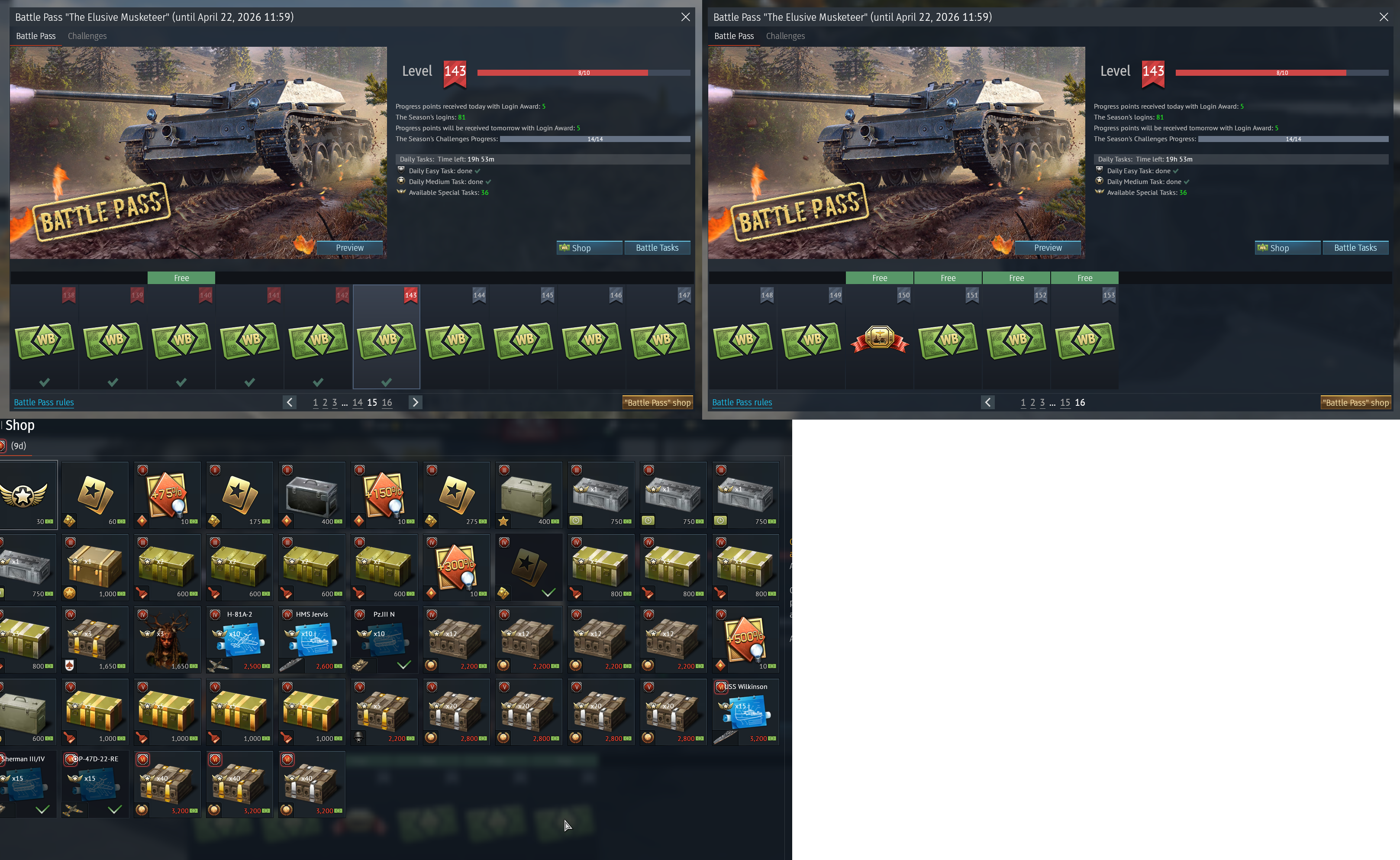 so, I'm at 143 right now. So I'm guessing that this will go on forever. I'm going to see how far I can go.I already got two premium Rank III vehicles. A Swedish Sherman and a French P47. They go great in the 3.7 lineups for those countries too. I just buy premium vehicles and universal backups. I guess I'll but that Chinese H-81A-2, Rank II vehicle, next. I'm not one for boats.I don't see what the big problem is with doing the Battle Pass. I'm going to sell the stupid Battle Pass vehicles later on.