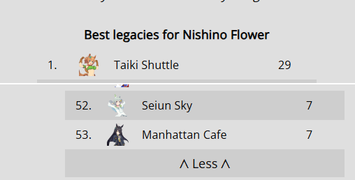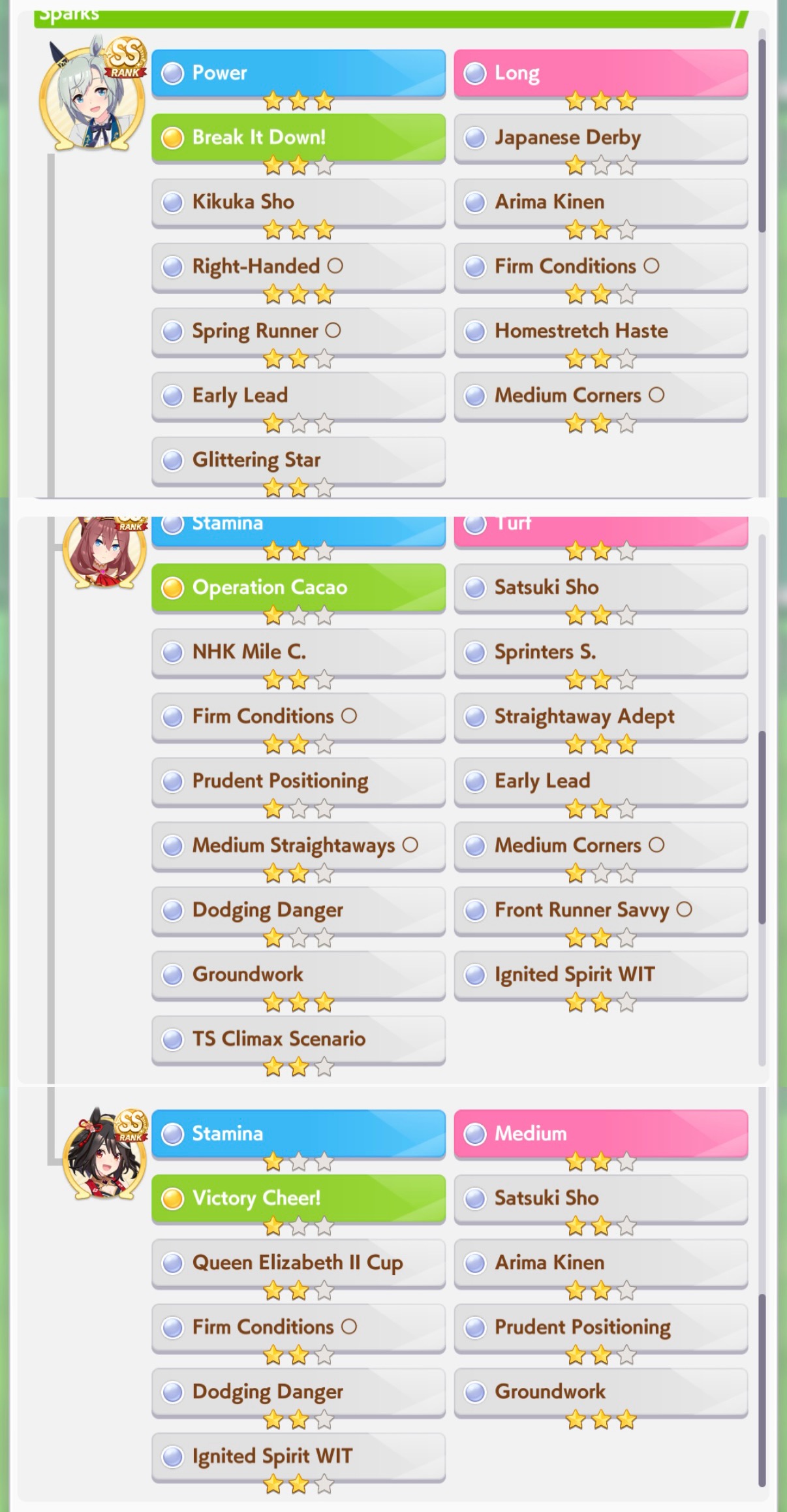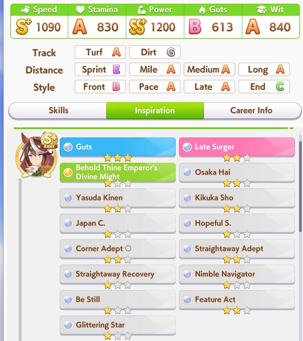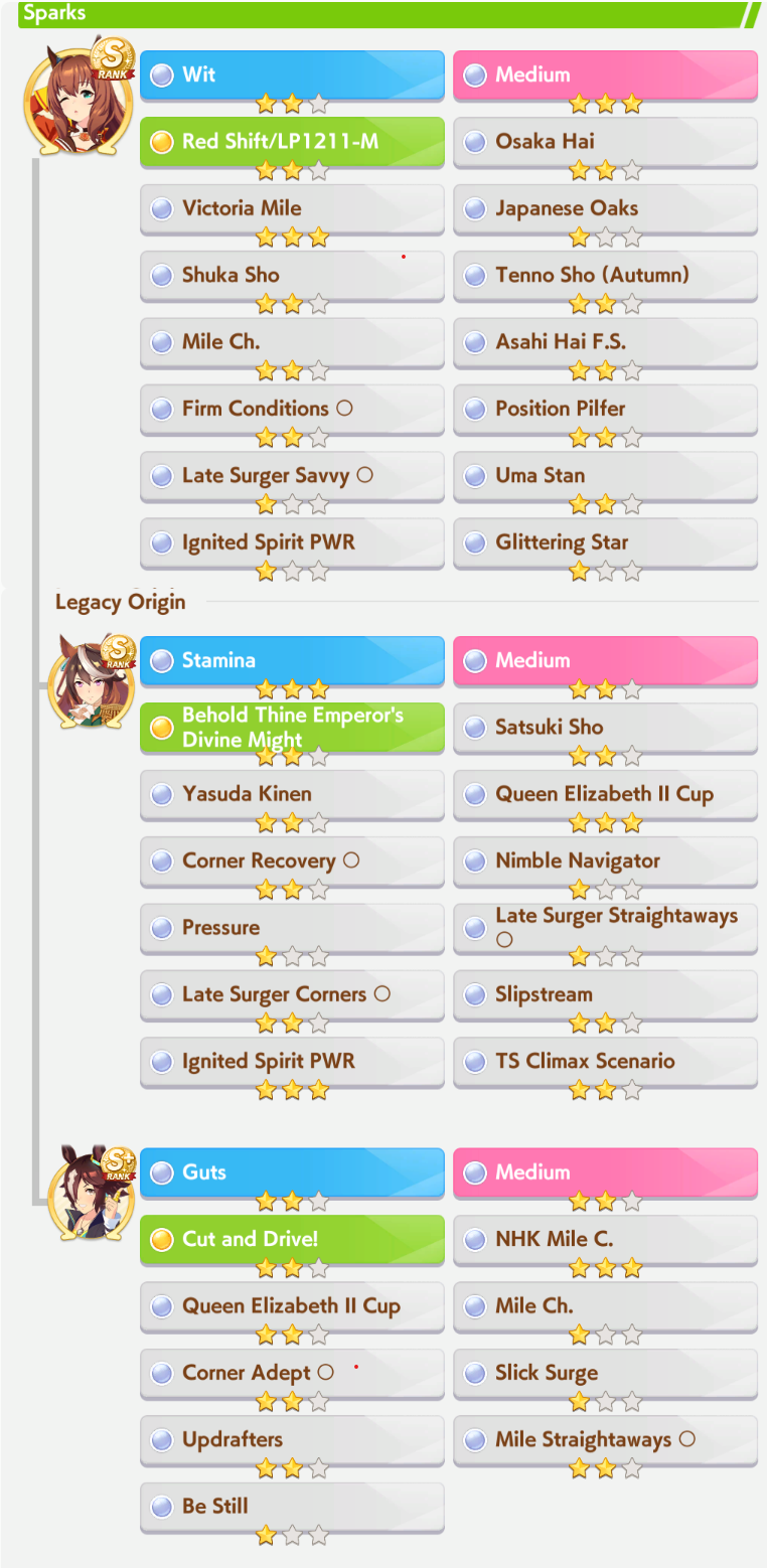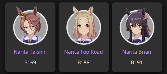 >>563436864>Kitasan>Nishino>2 10RB wit cardsnot badTry to make sure the deck you're using has 2 speed cards, 3 if 0% speed growth, and 50RB total.For your runs, do 35+ races and use/borrow parents that will get your ace to Mile/Medium/Long A if you're doing the Triple Crown Route, or at least Mile/Medium A if you're going Triple Tiara. Focus on the following shop items:>stat scrolls>stat manuals>Kale juice>cupcakes>energy drinks>+60% megaphones>primary/secondary stat anklets>good luck charm>+40% megaphones>gold hammersFor pre-debut, focus on a) getting Speed to level 2 and another facility to level 1, or just Speed to almost level 3. You can finish level 3 or get another facility to level 2 during the rest of junior year if you get lucky with energy items.Then focus on races for shop items, and resting/training on off-days. When you get good shop RNG, you can train. If you get shit RNG, you'll have to rest. Buy carrot BBQ asap if it shows up. Your goal is to have 2 +60% megaphones, 4 primary/secondary stat anklets, and enough energy for Classic Summer, which if you got lucky will be mostly friendship training.Post-summer, back to races for more shop items. As your friendships are maxed, start looking at rainbow trainings when your stat boosting item inventory grows, and if it's a G2/G3 race and the training will give you 40+ stats before boosting, you can take it instead of racing.Race/rest/train until senior summer, at which time blow your load (megaphones/anklets energy drinks/charms) on training. Race/train/rest until finale, when you'll blow the last of your load. I like to save 3 good luck charms for the finale so I can give energy requirements the finger there.This should let you reliably hit S/S+ in your ace/parent runs. Lemme know if this is helpful at all.