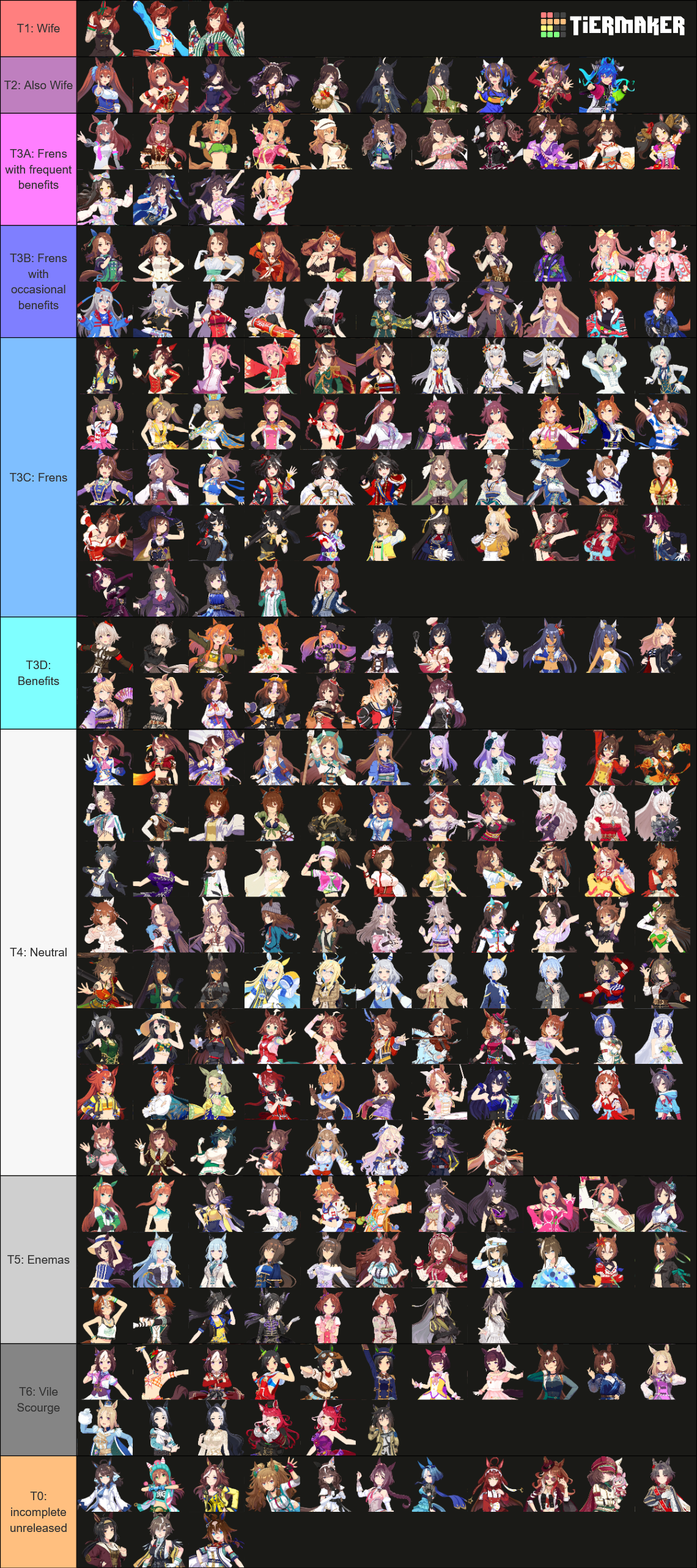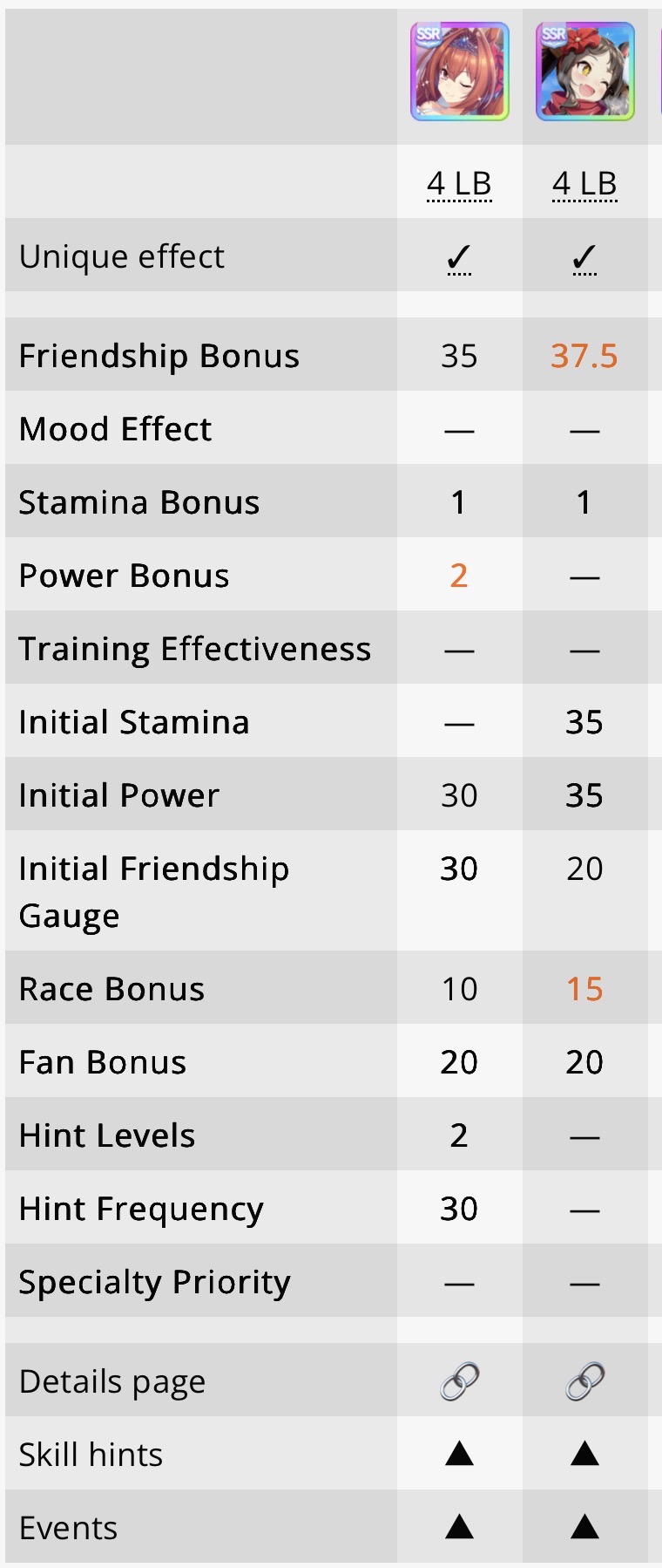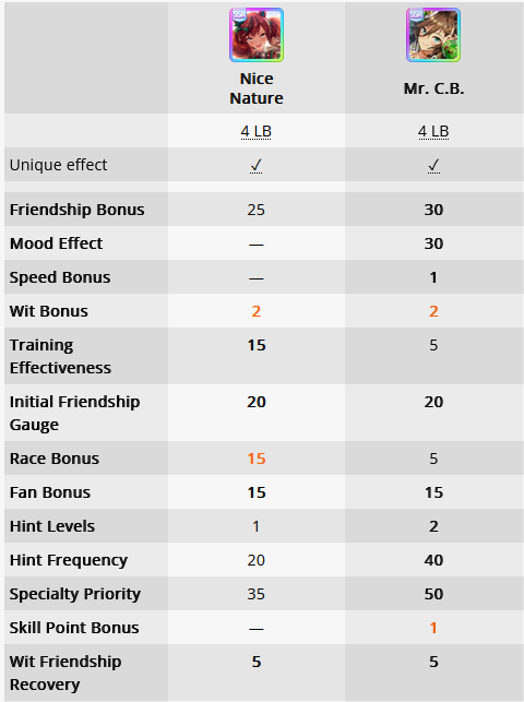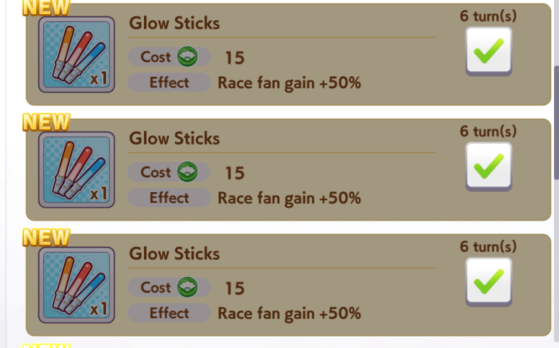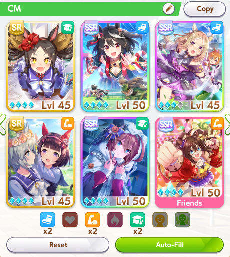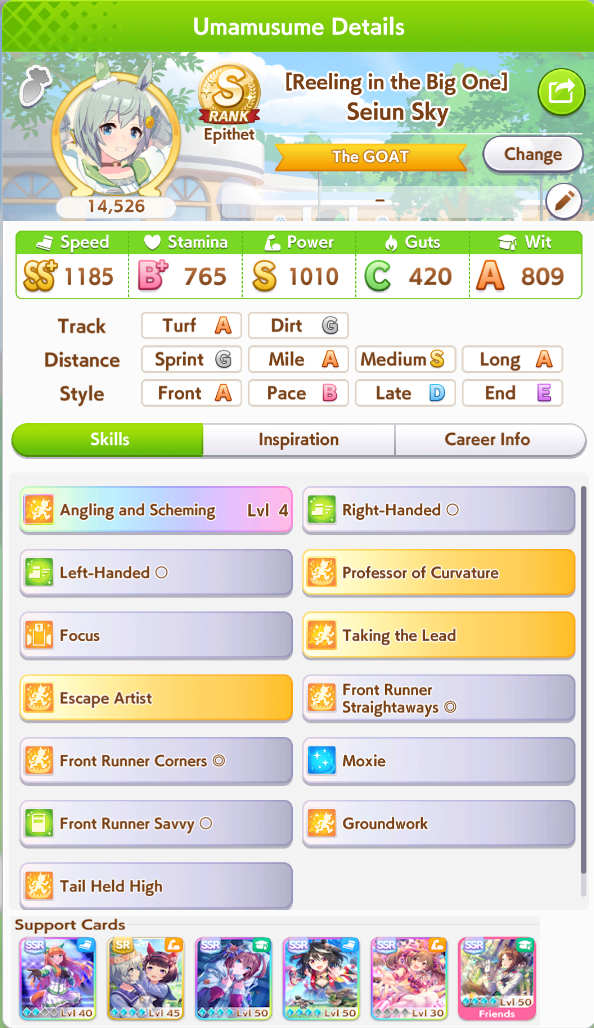 >>563436864>Kitasan>Nishino>2 10RB wit cardsnot badTry to make sure the deck you're using has 2 speed cards, 3 if 0% speed growth, and 50RB total.For your runs, do 35+ races and use/borrow parents that will get your ace to Mile/Medium/Long A if you're doing the Triple Crown Route, or at least Mile/Medium A if you're going Triple Tiara. Focus on the following shop items:>stat scrolls>stat manuals>Kale juice>cupcakes>energy drinks>+60% megaphones>primary/secondary stat anklets>good luck charm>+40% megaphones>gold hammersFor pre-debut, focus on a) getting Speed to level 2 and another facility to level 1, or just Speed to almost level 3. You can finish level 3 or get another facility to level 2 during the rest of junior year if you get lucky with energy items.Then focus on races for shop items, and resting/training on off-days. When you get good shop RNG, you can train. If you get shit RNG, you'll have to rest. Buy carrot BBQ asap if it shows up. Your goal is to have 2 +60% megaphones, 4 primary/secondary stat anklets, and enough energy for Classic Summer, which if you got lucky will be mostly friendship training.Post-summer, back to races for more shop items. As your friendships are maxed, start looking at rainbow trainings when your stat boosting item inventory grows, and if it's a G2/G3 race and the training will give you 40+ stats before boosting, you can take it instead of racing.Race/rest/train until senior summer, at which time blow your load (megaphones/anklets energy drinks/charms) on training. Race/train/rest until finale, when you'll blow the last of your load. I like to save 3 good luck charms for the finale so I can give energy requirements the finger there.This should let you reliably hit S/S+ in your ace/parent runs. Lemme know if this is helpful at all.