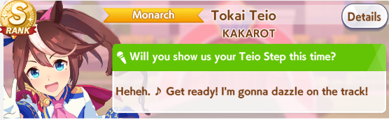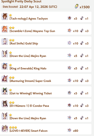 Previous: >>563421338>Global Game NewsLink your account to Cygames iDCurrent Scenario: Make A New Track aka "Trackblazer"Current Rate Up Trainee: Ballroom Seiun Sky (3*), Ballroom Fuji Kiseki (3*)Current Rate Up Support Cards: SSR Symboli Rudolf (STA), SSR Sirius Symboli (WIT)Current CM: Aries Cup - Nakayama Turf 2000mCurrent Event: Ligne Droite Story Event>Schedule03/02 - 04/14 - Halved TP Cost & 2x Career Mode Rewards04/12 - Nishino Flower (3*), Daiwa Scarlet (SSR), Sweepy (SR)04/20 - Yaeno Muteki (3*), Ines Fujin (SSR), Twin Turbo (SSR)04/20 - Aries Cup - Medium/Right/Spring/Firm/200004/26 - Golshi Week Celebration04/26 - Cheerleader Nice Nature (3*), Cheerleader King Halo (3*), Bamboo Memory (SSR), Seeking the Pearl (SSR)04/26 - Tracen Cheer Squad Story Event04/30 - Ines Fujin (3*), MR. C.B. (SSR), Tokai Teio (SR)https://pages.snep.pw/uma/anni-skill-changes>JP Game NewsCurrent Rate Up: Lucky Lilac (3*), SSR Aston Machan, SR Hishi AmazonNew Scenario "Beyond Dreams" releasedTimeline: https://uma.moe/timelineCygames Webstore: https://webstore.cygames.com/en/umamusume_en>Thread Clubshttps://rentry.co/umaglobalclublistYou must be E3 (20k points) to join a circle. Apply with /uma/ or /vg/ in your profile or post ID in the thread.>All Guides & Resourceshttps://rentry.org/uma26Game databasehttps://gametora.com/umamusume (Click the gear to switch between JP / global server info)A basic guide for newfagshttps://rentry.org/umaglobalFind networks if your region is blocked from the game or clienthttps://www.umavpn.topSeiyuu & Concertshttps://rentry.org/umstUmamusume Birthday Calendarhttps://ウマ娘.攻略.tools/events/birthdayUma Texthttps://umareader.idsmile.xyzCustom Stickershttps://schizo.farm/resources/stickers