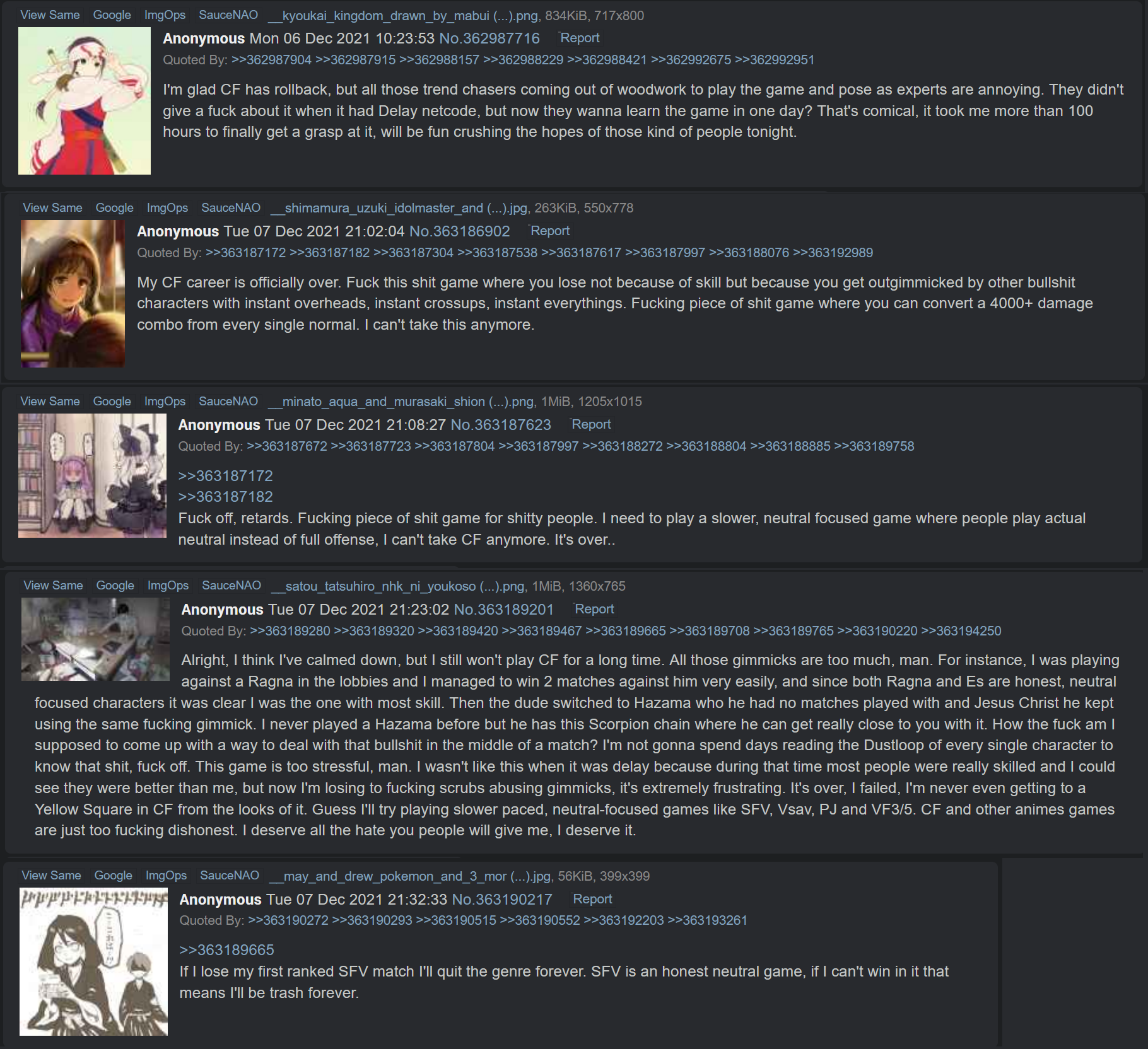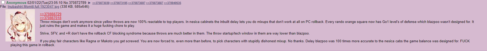 >>563568261What rank did you get placed in?>>563577731You can also RC>>563577914If this is also about burst then I'd prefer my opponents waste their bust fullscreen / in poke range like you mentioned rather than saving it for when I hit them with c.S or f.S.>>563578214The classic.