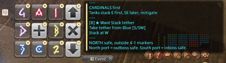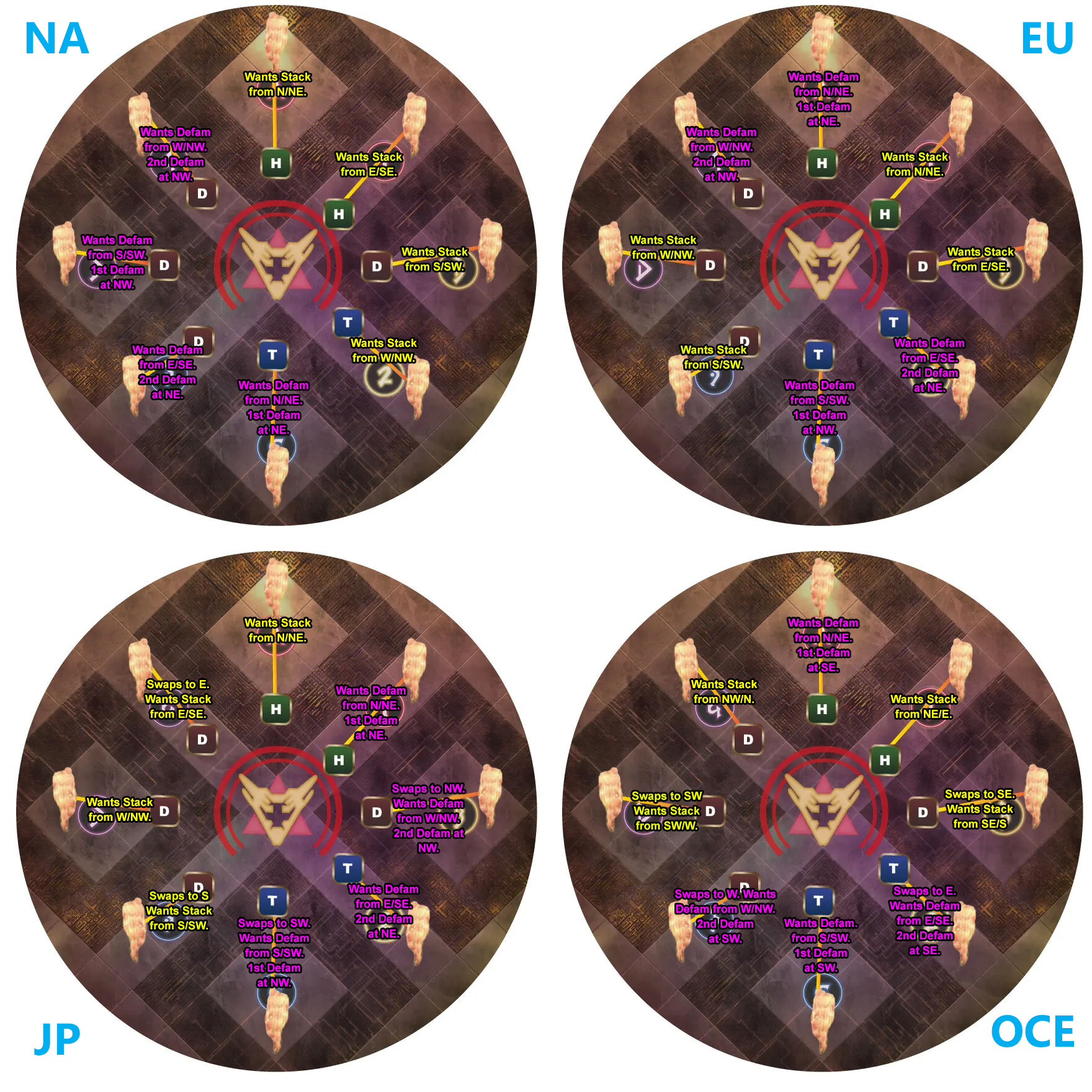 >>563470324For NA style at least, doesn't work in other regions: /micon A waymark/e -----/e [A] Want Stack tether/e Take tether from Red [N/NE]/e Stack at E/micon 1 waymark/e -----/e [1] Want Stack tether/e Take tether from Yellow [E/SE]/e Stack at E/micon B waymark/e -----/e [B] Want Stack tether/e Take tether from Blue [S/SW]/e Stack at W/micon 2 waymark/e -----/e [2] Want Stack tether/e Take tether from Purple [W/NW]/e Stack at W/micon C waymark/e -----/e [C] ● Want Defamation tether/e Take tether from Red [N/NE]/e First Defamation at NE, Stack at E/micon 3 waymark/e -----/e [3] ● Want Defamation tether/e Take tether from Yellow [E/SE]/e Stack at E, Second Defamation at NE/micon D waymark/e -----/e [D] ● Want Defamation tether/e Take tether from Blue [S/SW]/e First Defamation at NW, Stack at W/micon 4 waymark/e -----/e [4] ● Want Defamation tether/e Take tether from Purple [W/NW]/e Stack at W, Second Defamation at NW