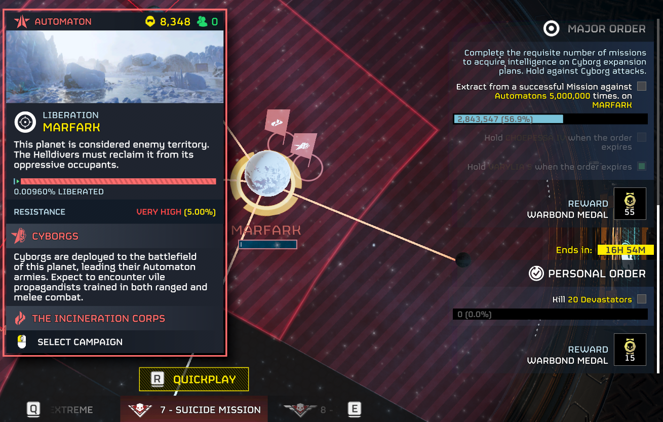 HELLDIVERS 2 is a 2024 crossplay, co-op, squad-based, PvE 3rd person shooter for PC, PS5 and XBox Series X/S where players fight against hordes of alien insects, robots and squids to Spread Democracy™. Players wage war on contested planets, each with a different biome, completing as many objectives as possible in a procedurally generated level while constrained by a time limit. With enough successful missions, a planet can be defended or liberated, and the player base must combine their efforts as much as possible to Liberate™ the galaxy.